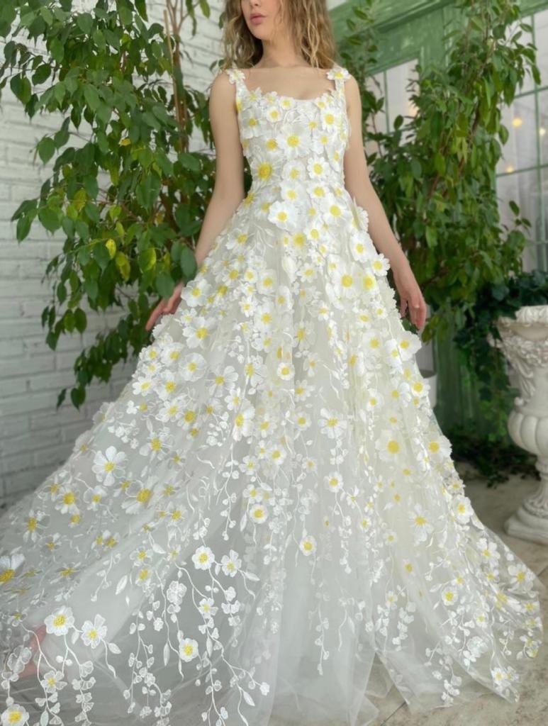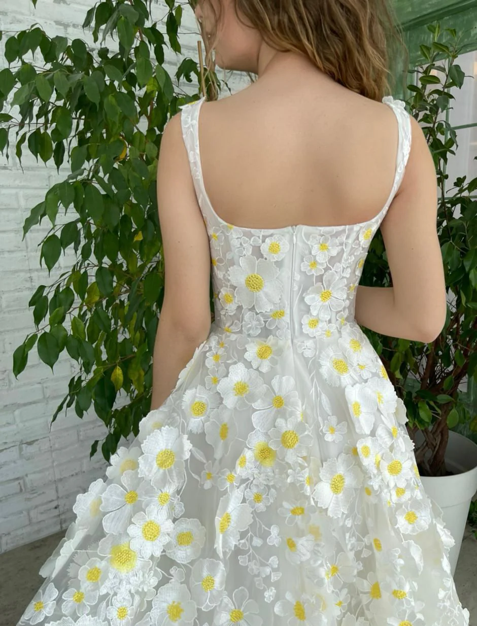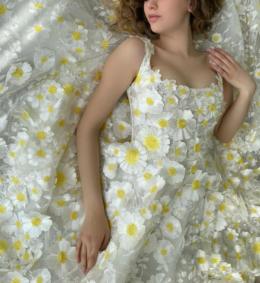 -Full embroidered lace fabric with white and yellow blooms, our special daisies