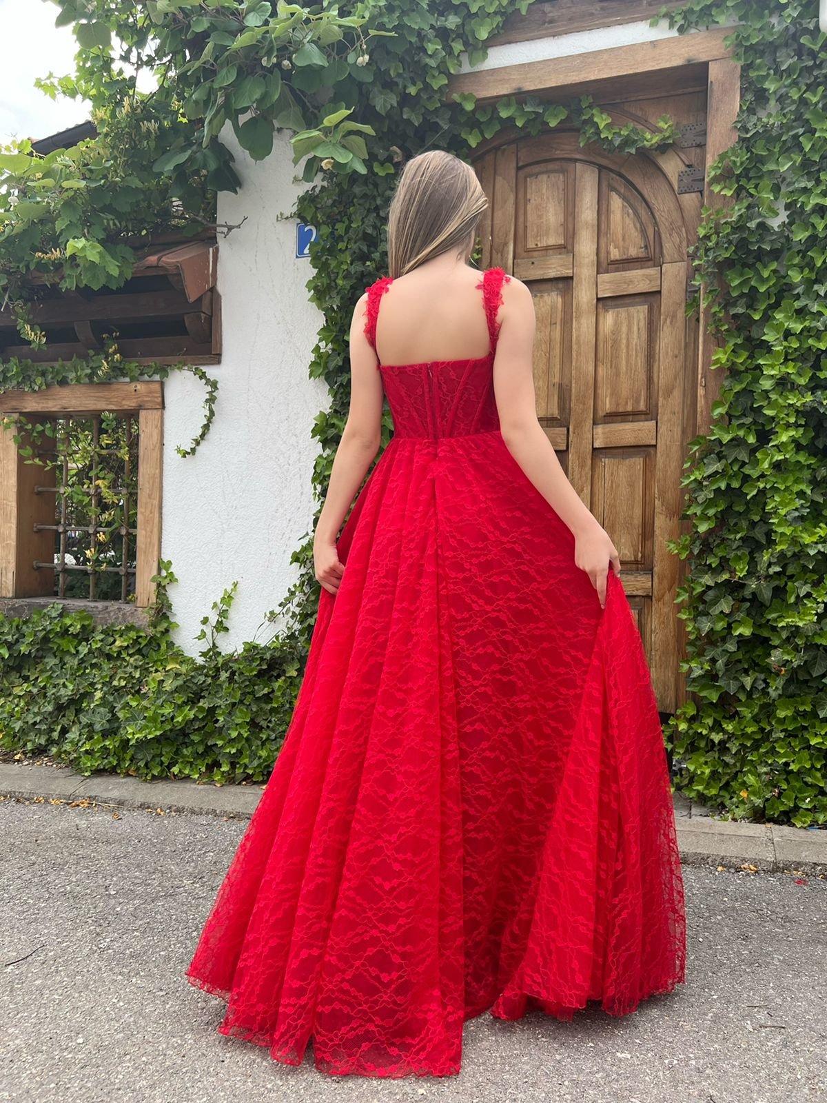 -Leavers lace in a scarlet red color