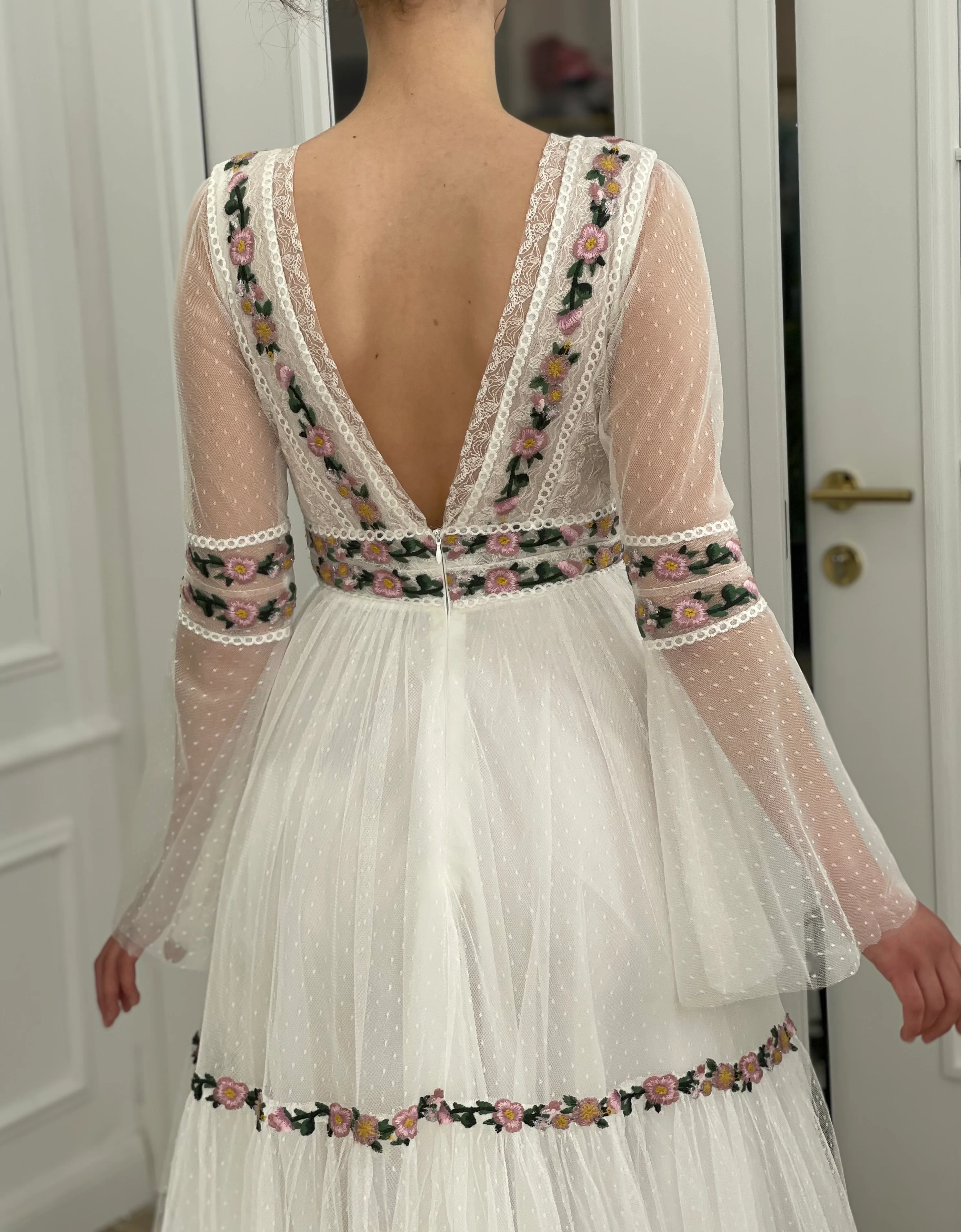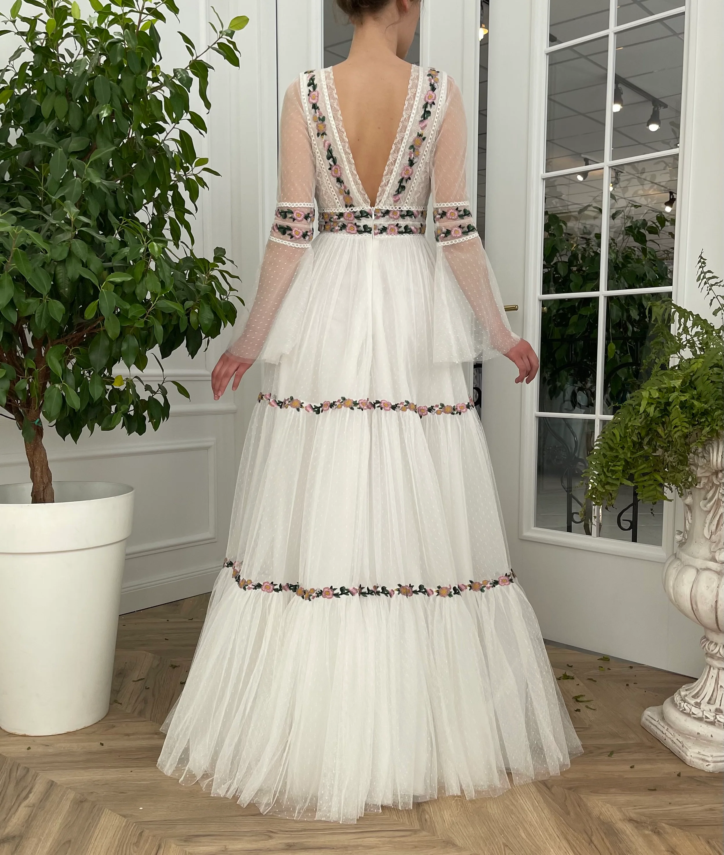 The soft white hue with embroidered rose flowery details, makes for a perfect whimsical wedding gown.