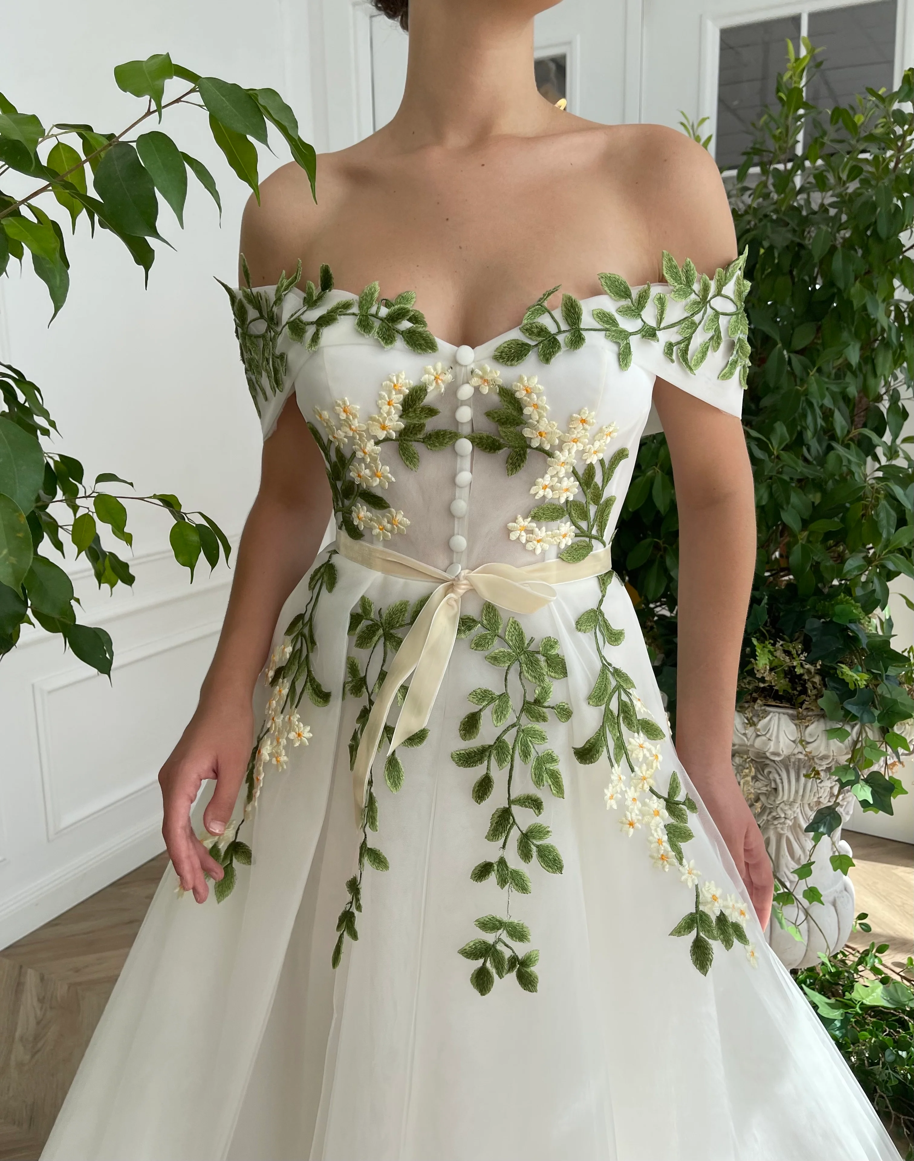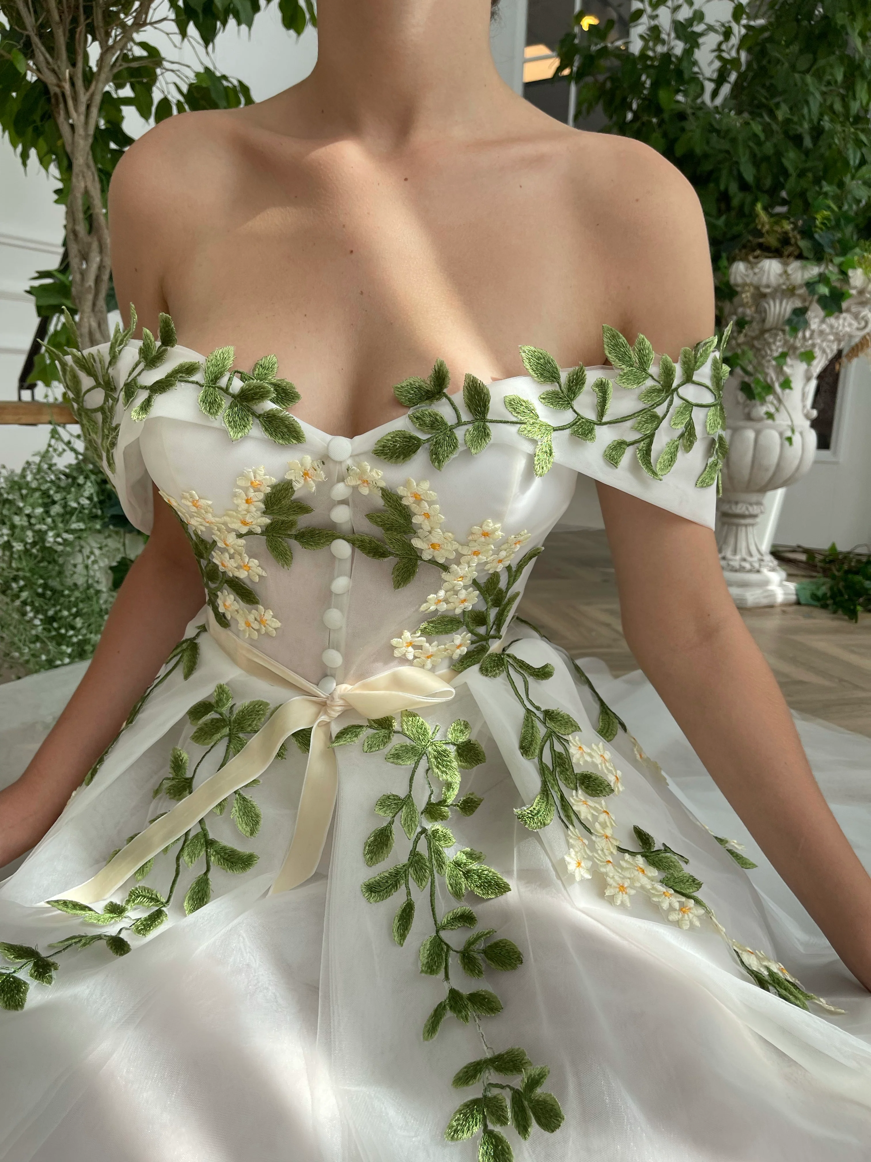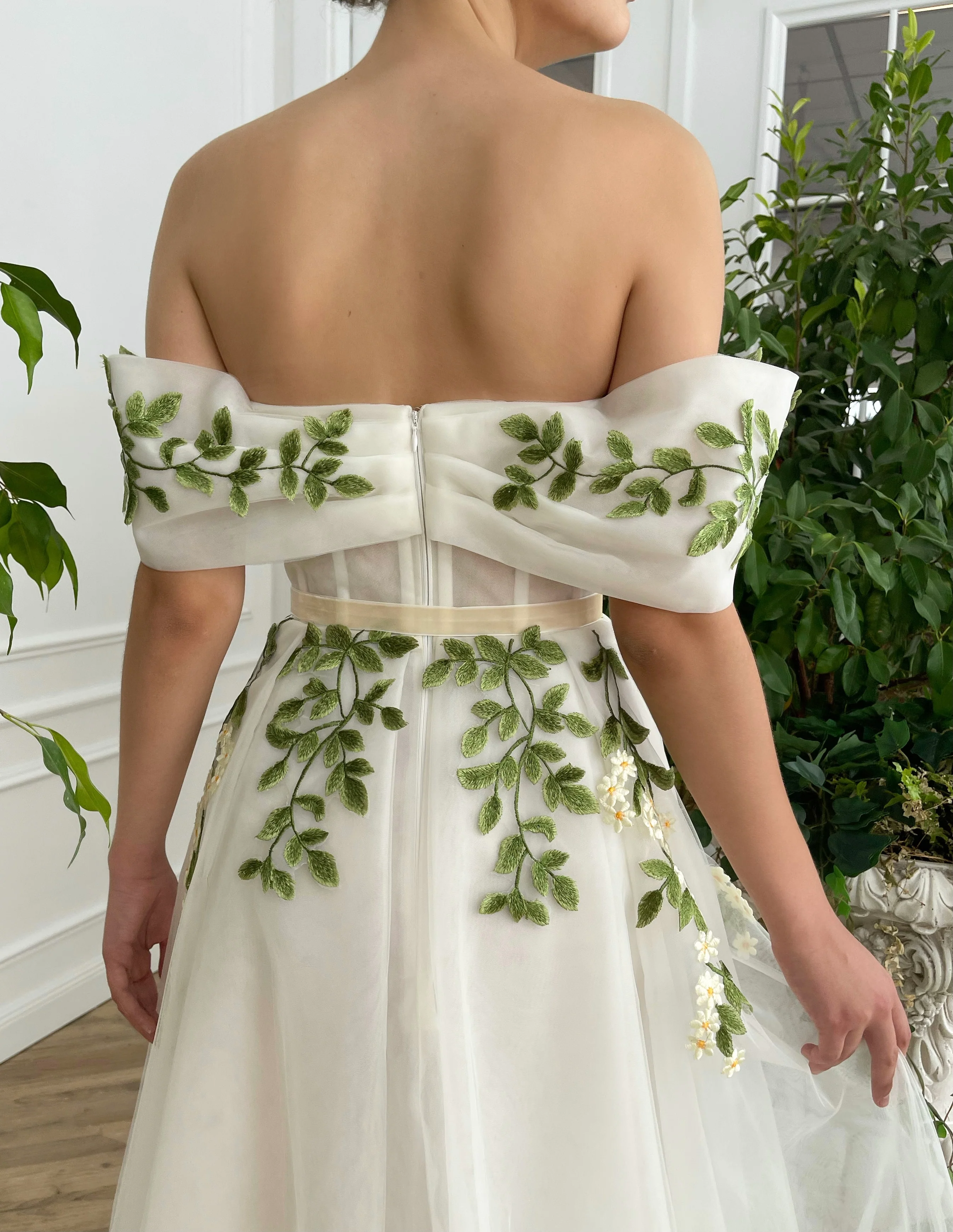 -Embellished with embroidered green leaves and flowery details