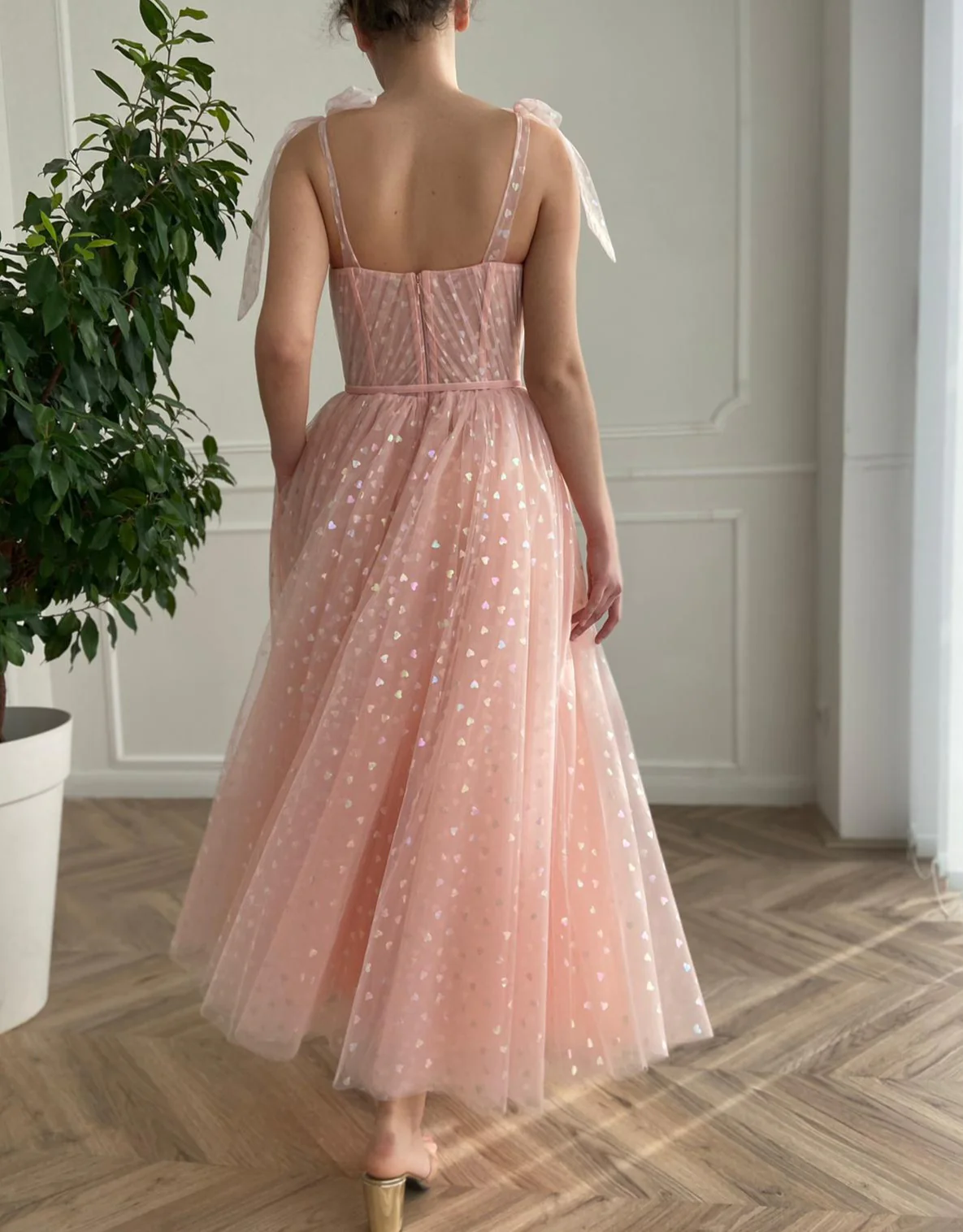 -Rose pink tulle fabric with printed hearts