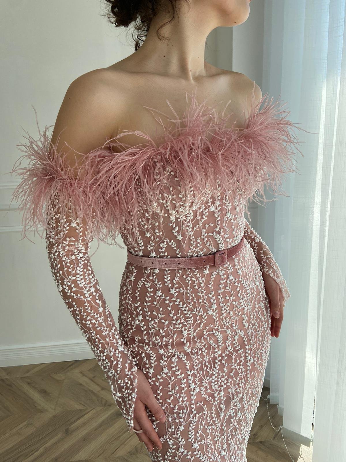 -Mermaid silhouette style with feathers and a decorative belt