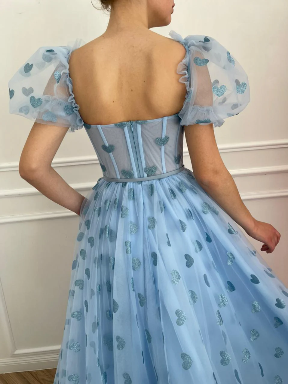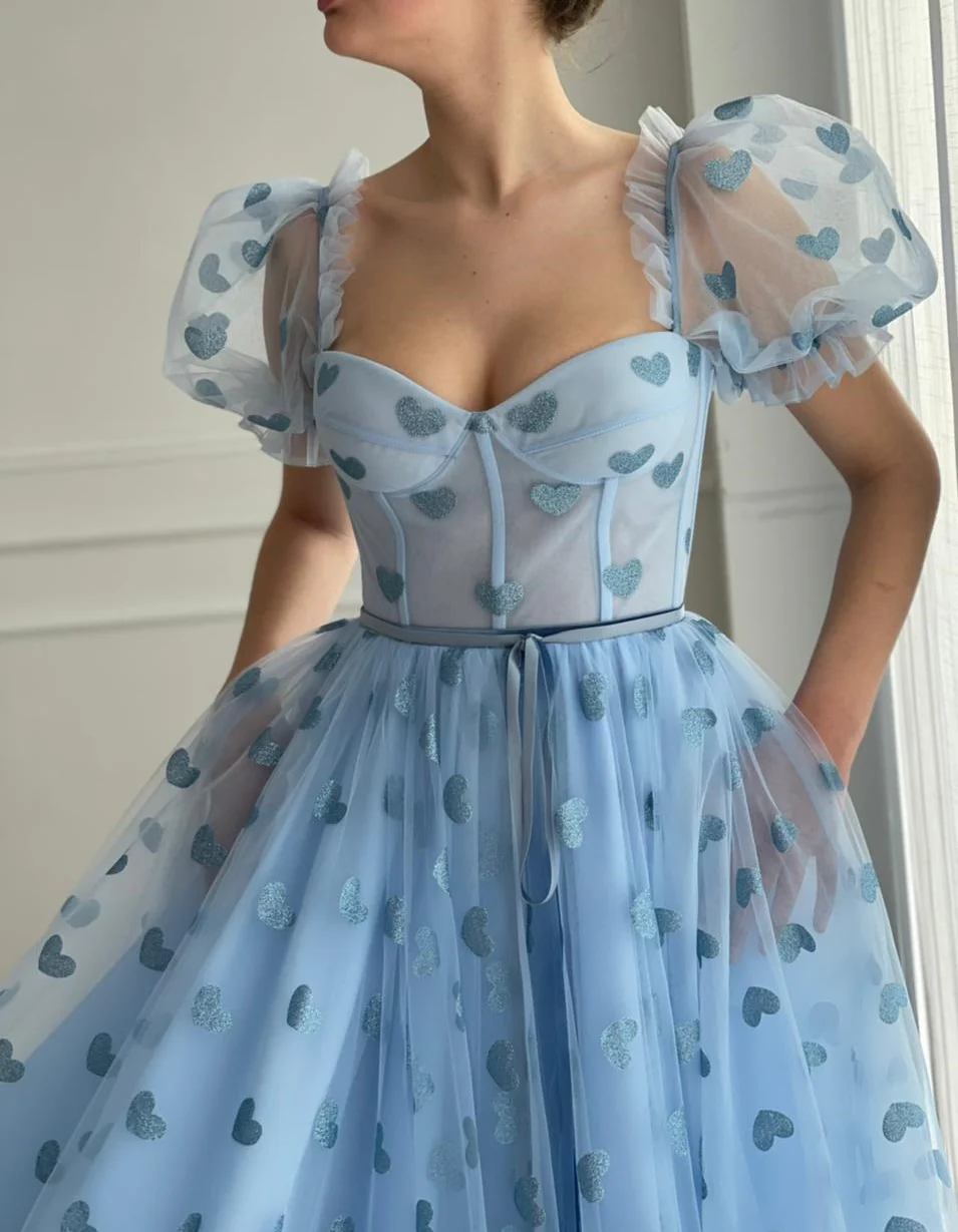 -Tulle fabric with printed blue hearts