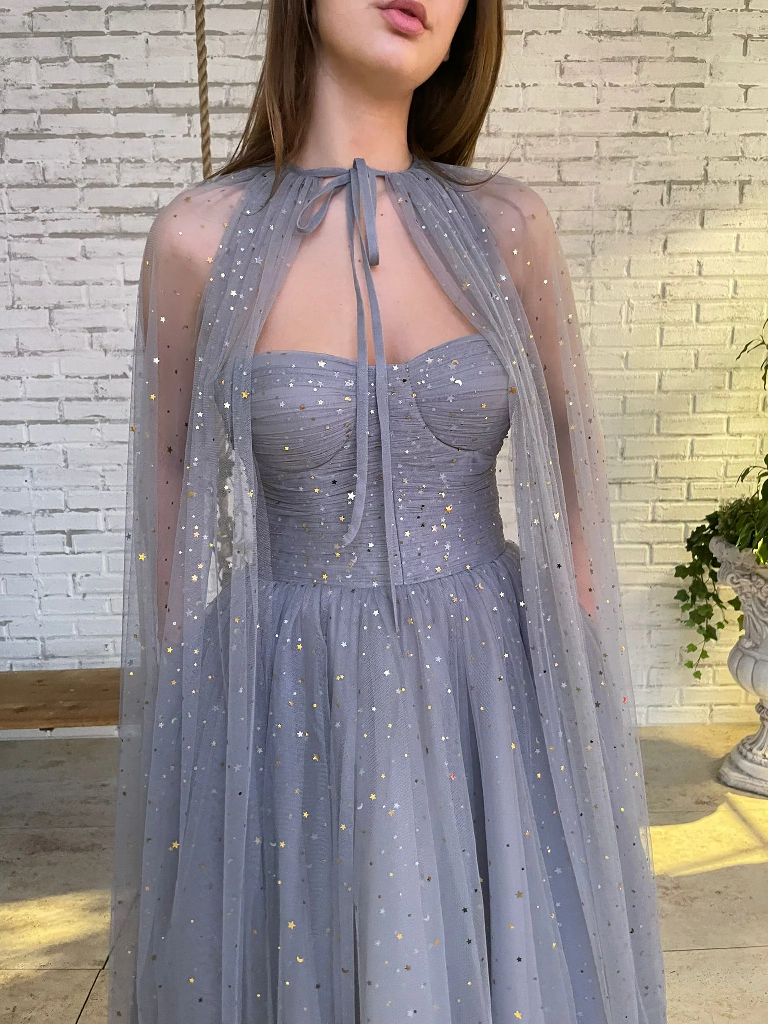 - Starry tulle fabric in a pastel grey hue