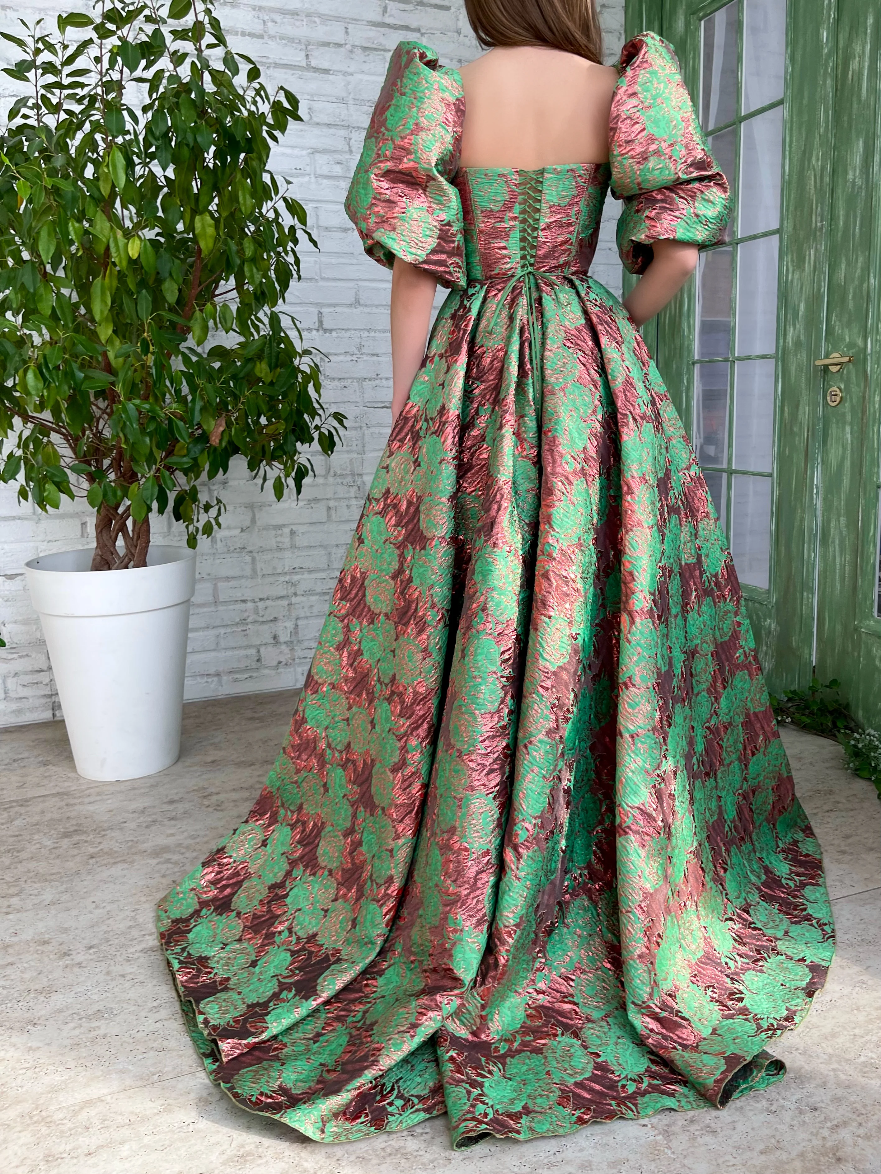 - Floor-length skirt and a court train