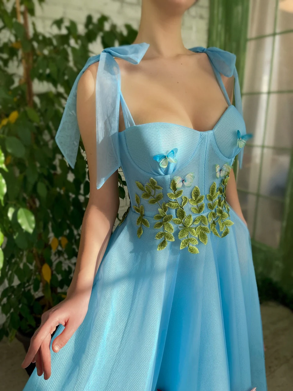 -Embellished garden embroidery bottom skirt, with green leaves at the waist and powder butterflies