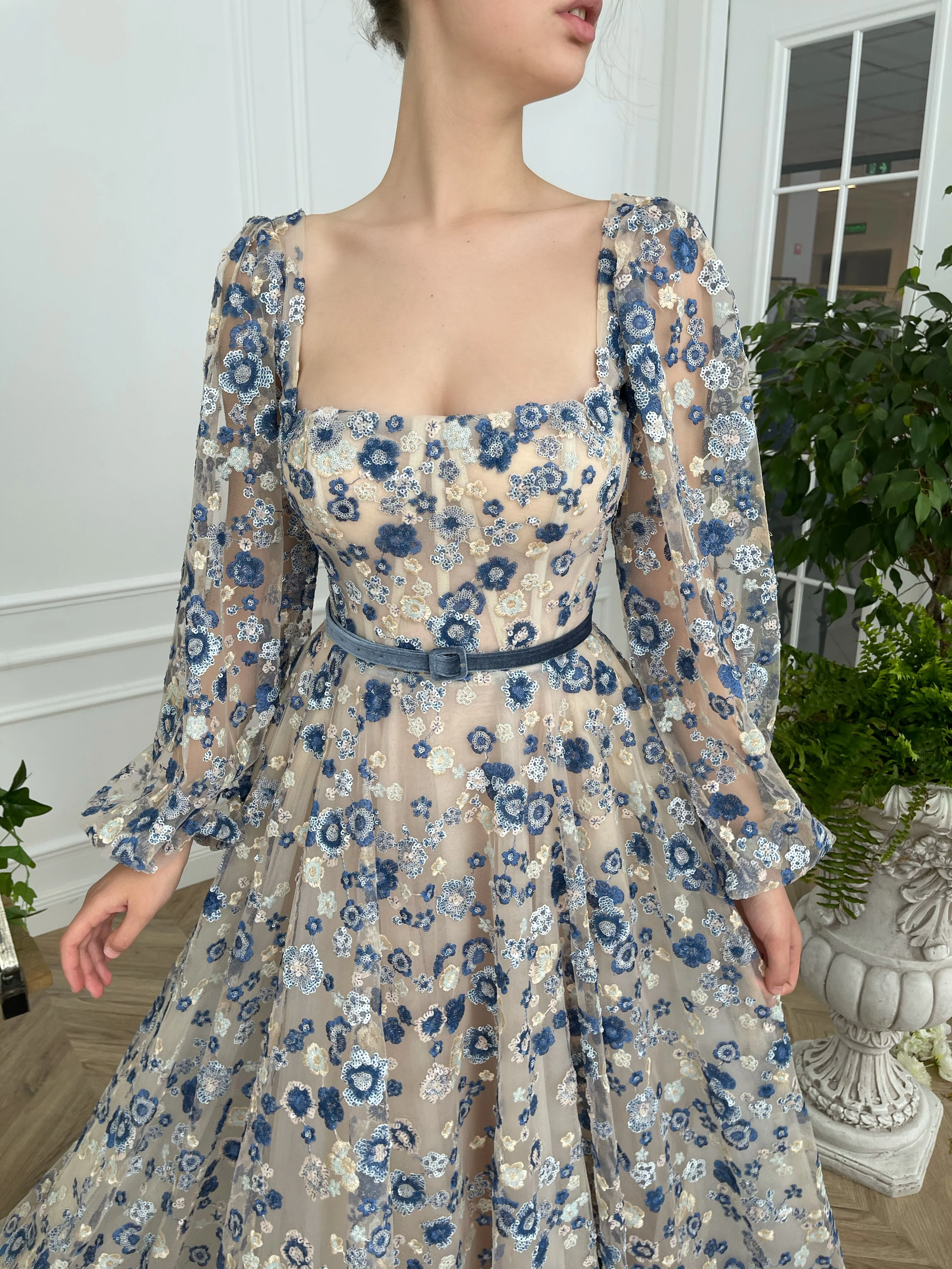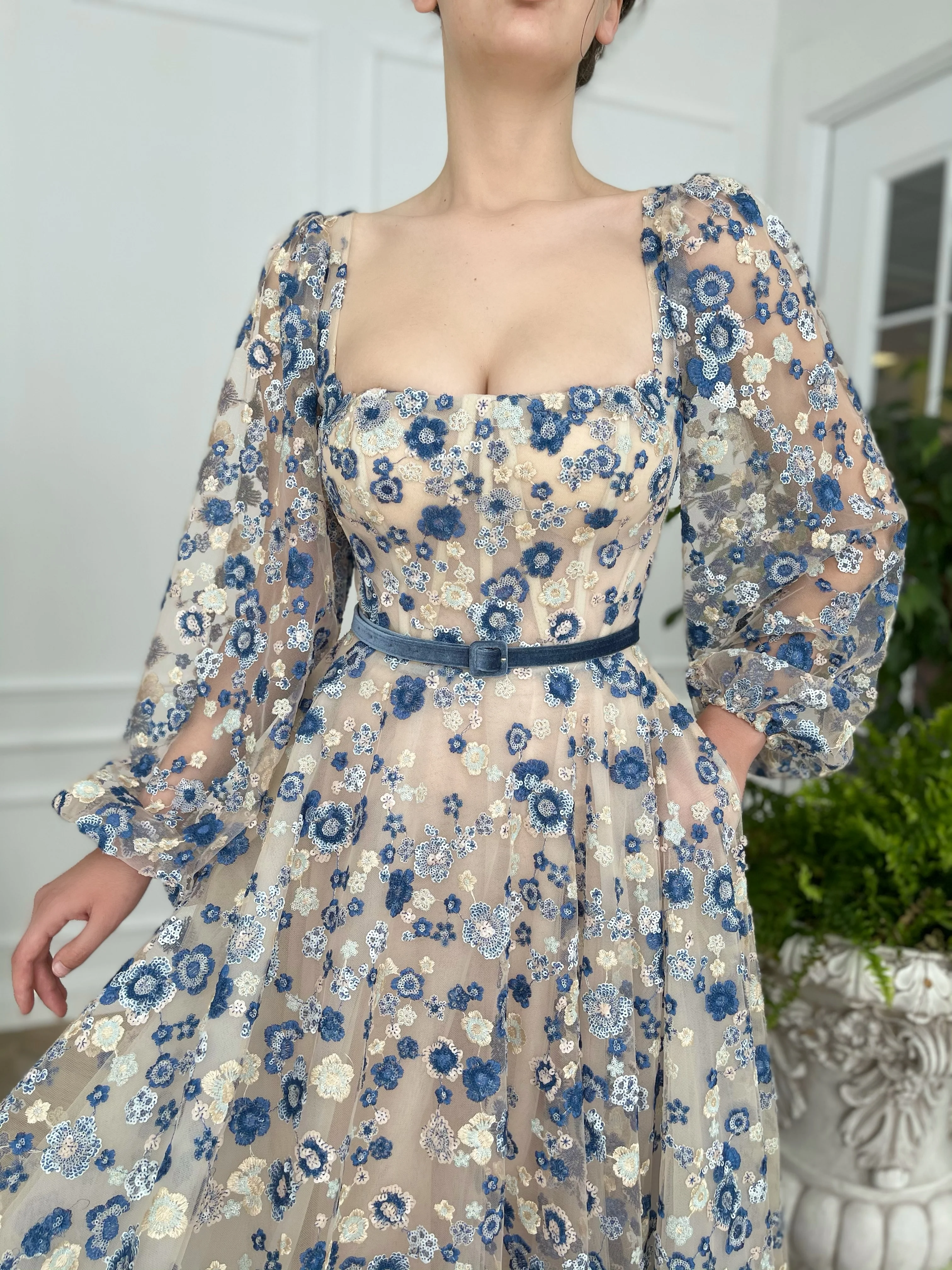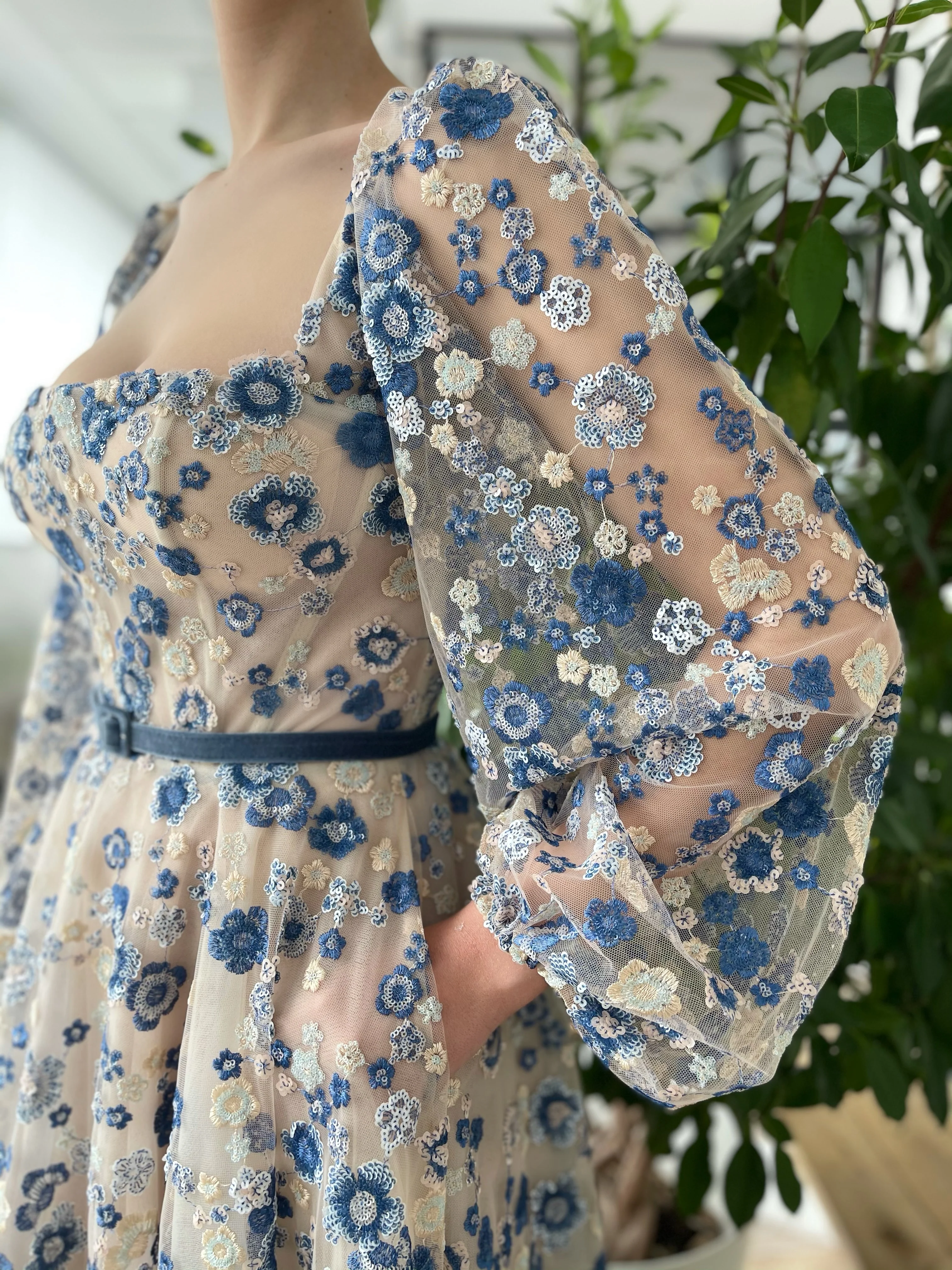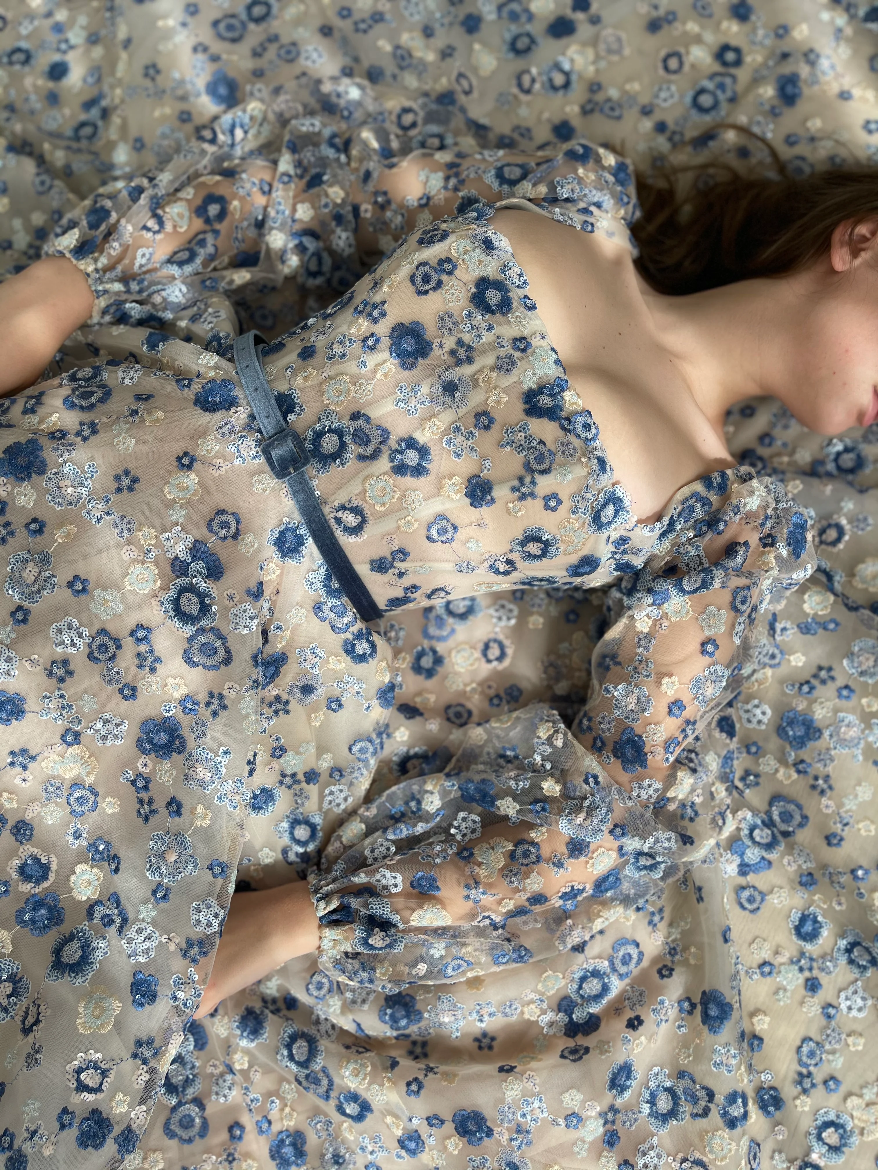 -Royal blue sequinned floral lace and nude tulle.