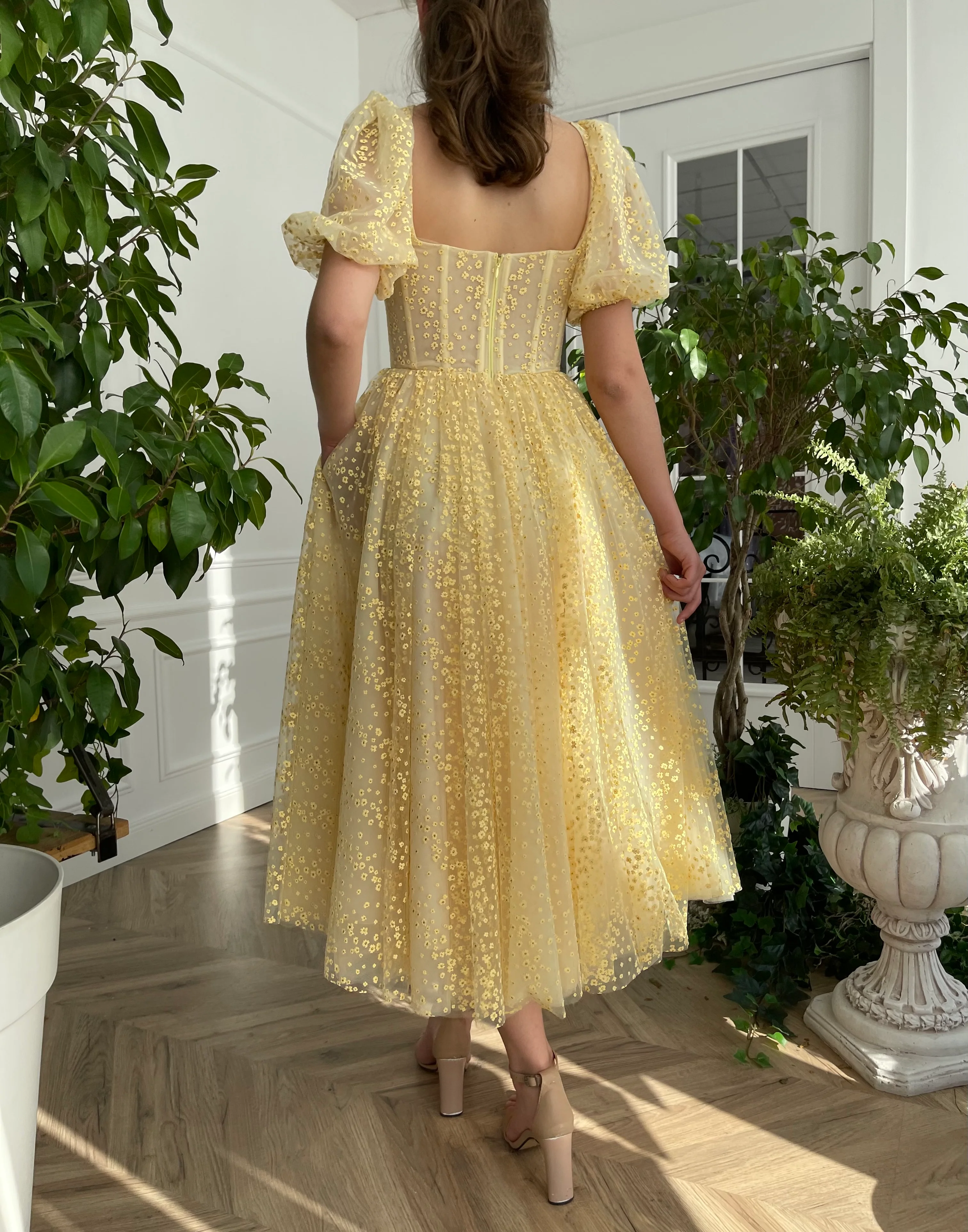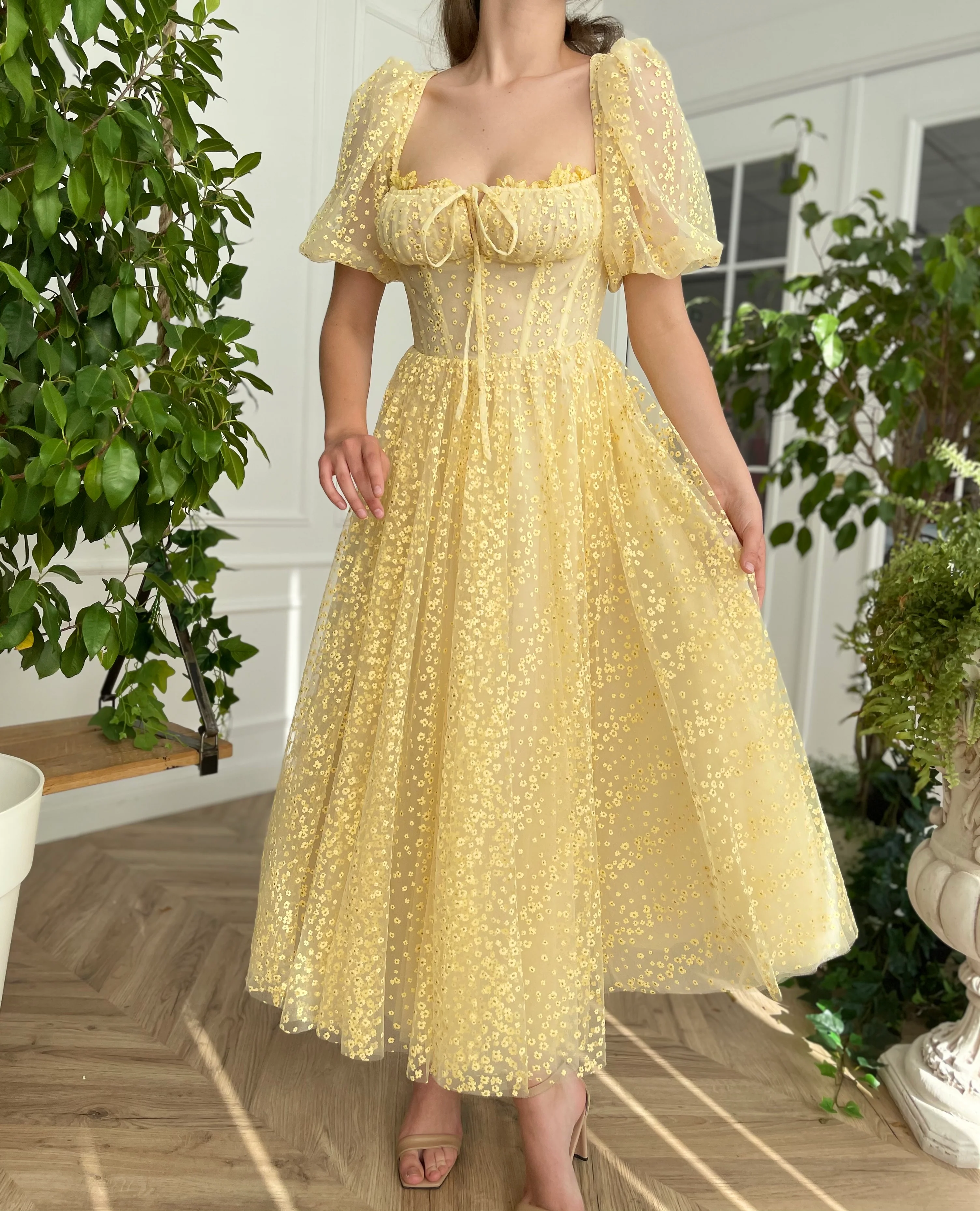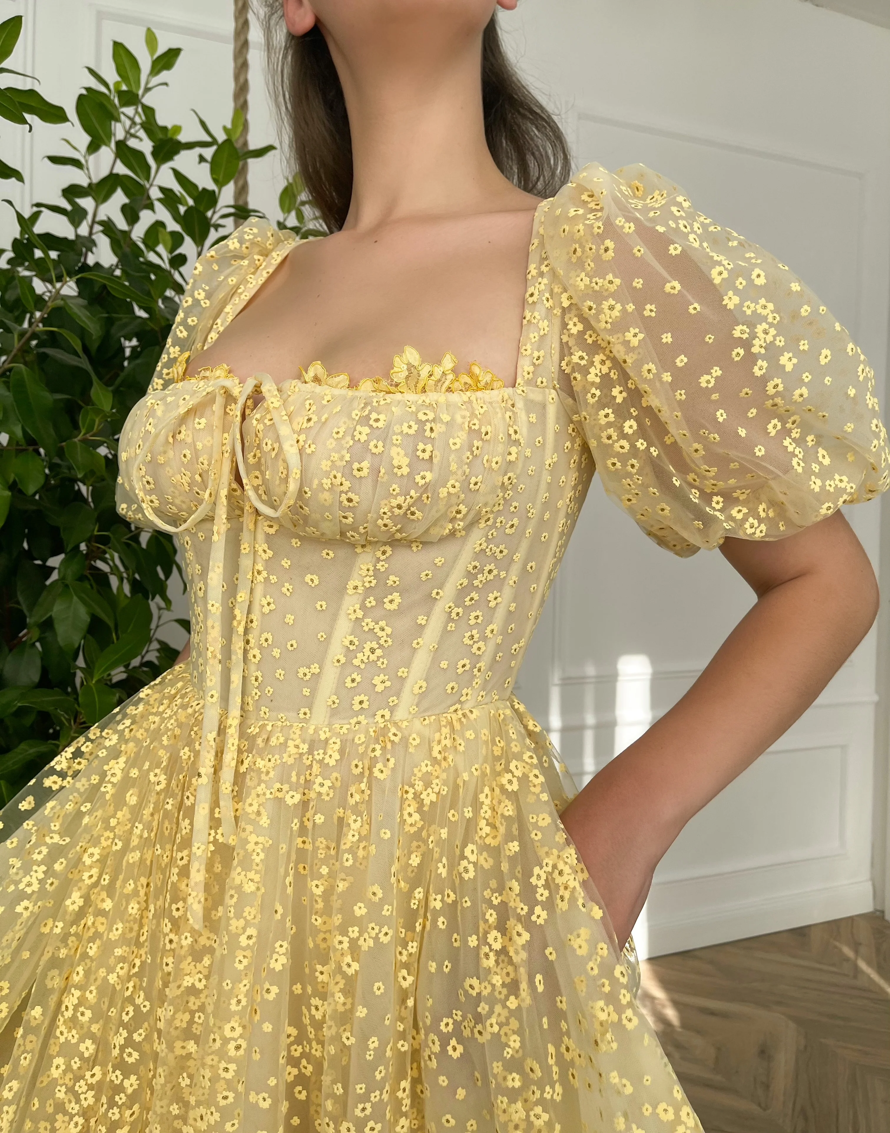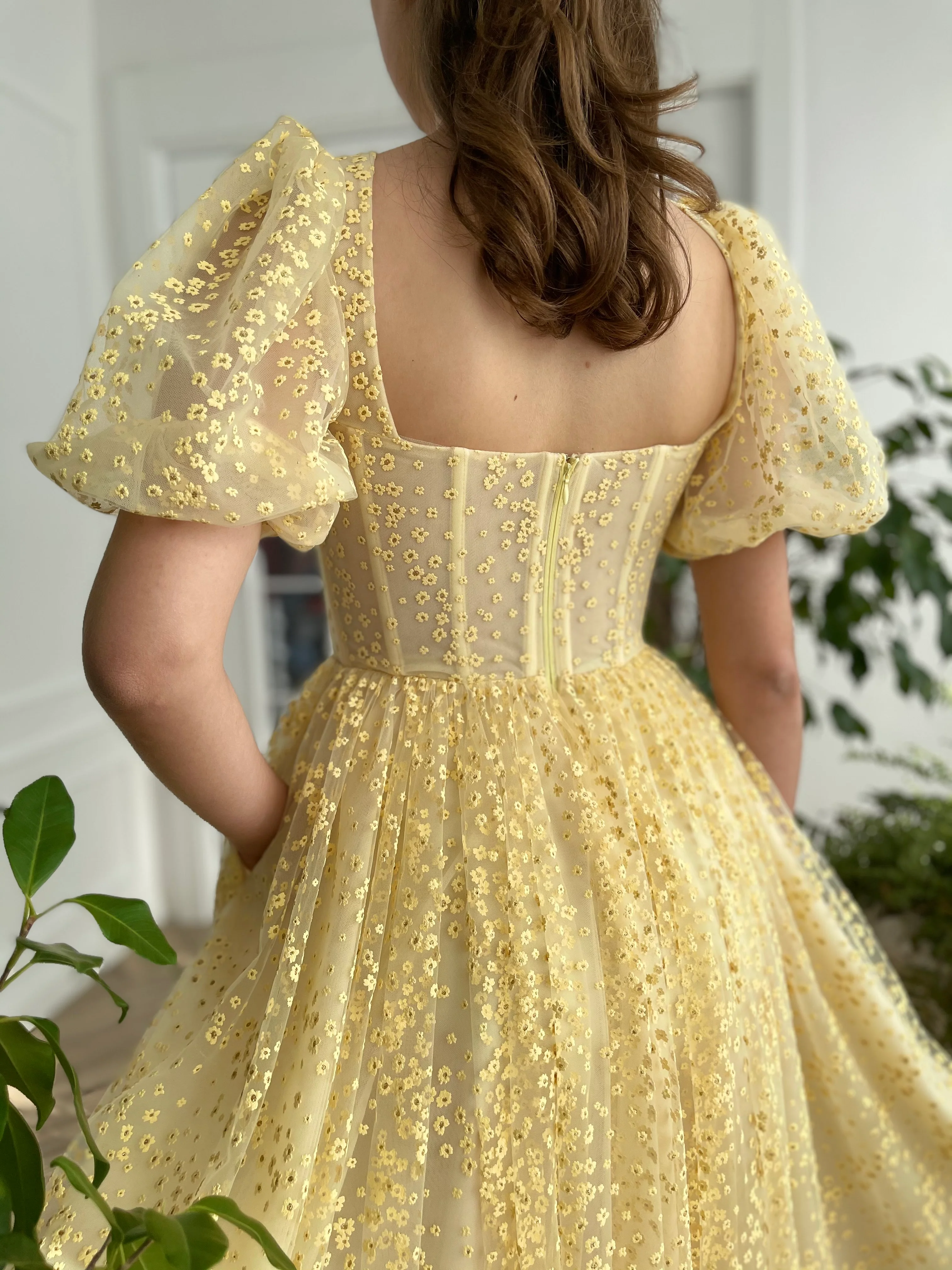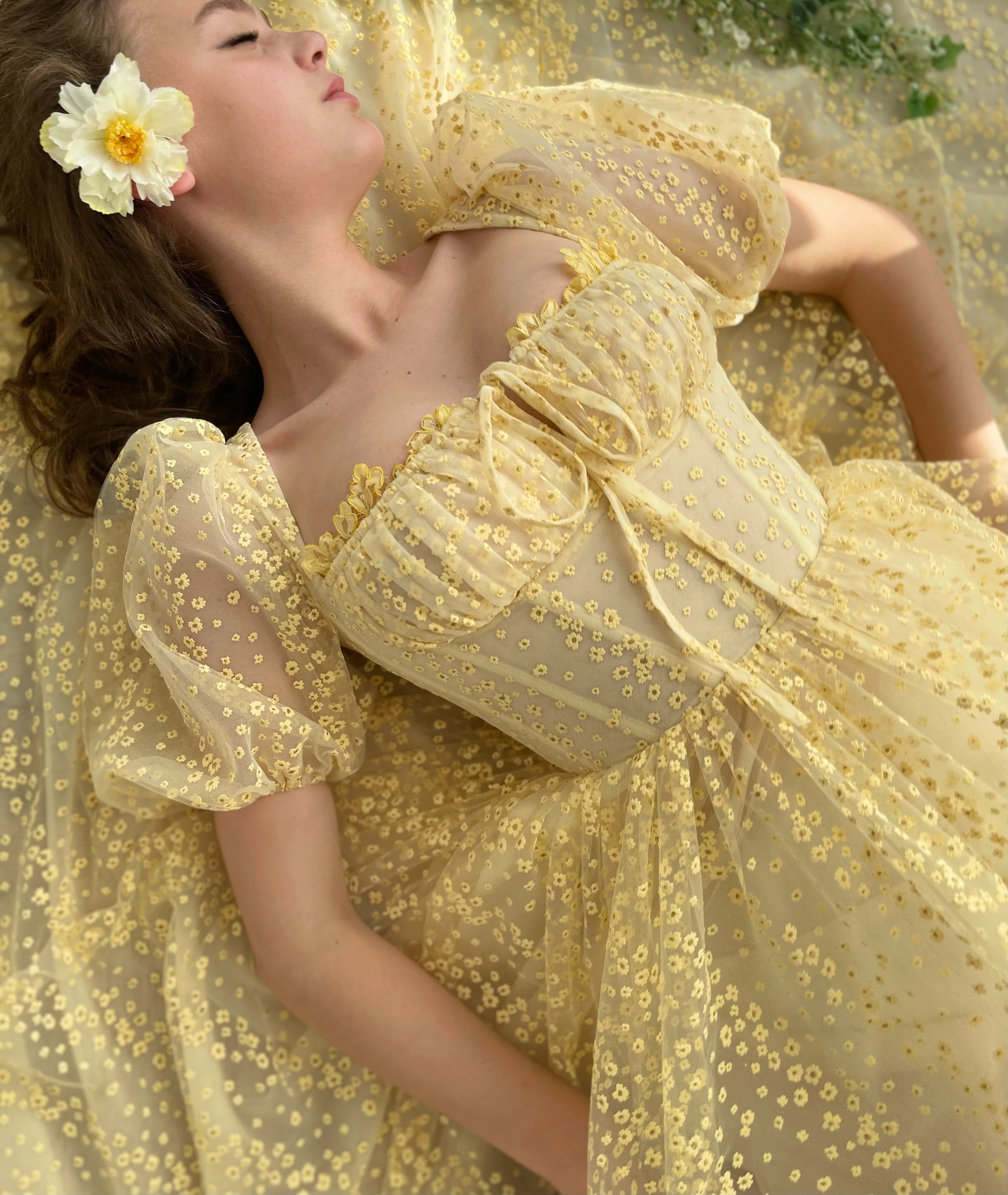 -Bumblebee yellow tulle with embroidered dandelions