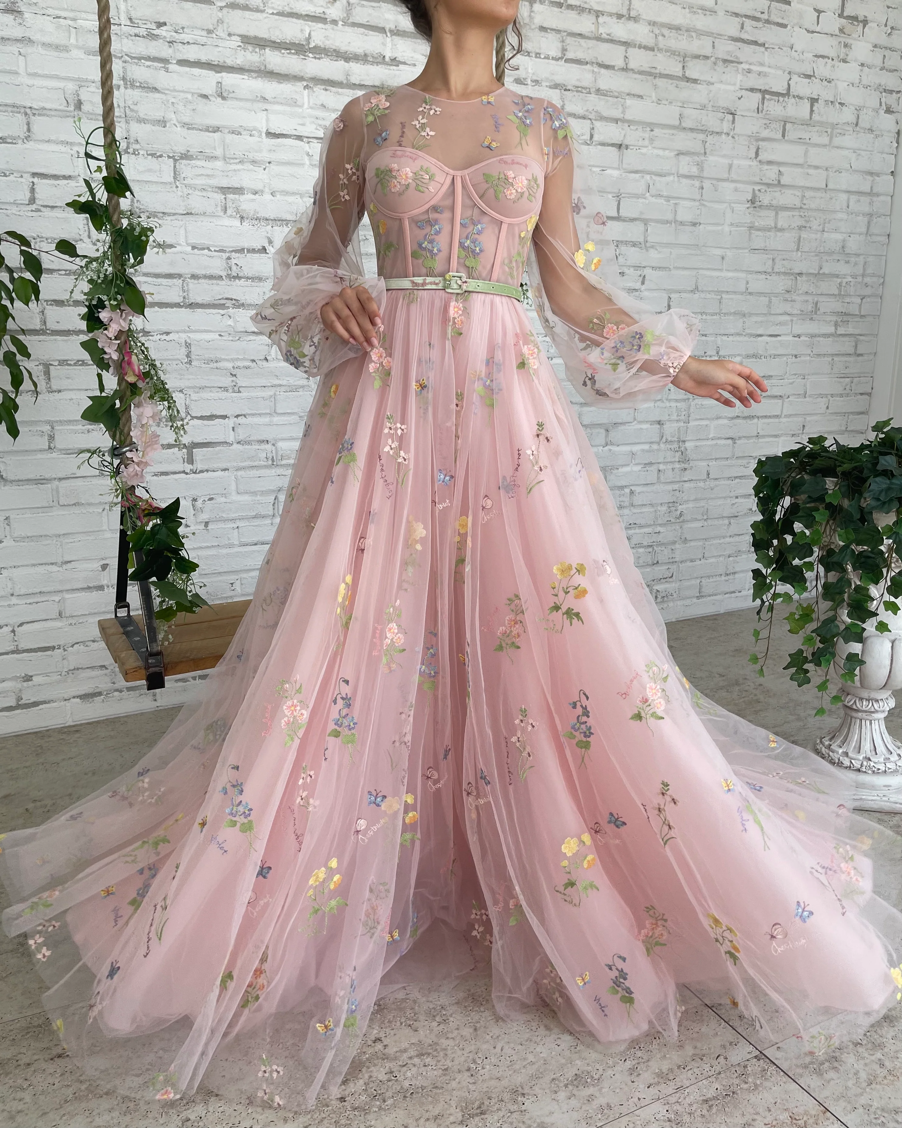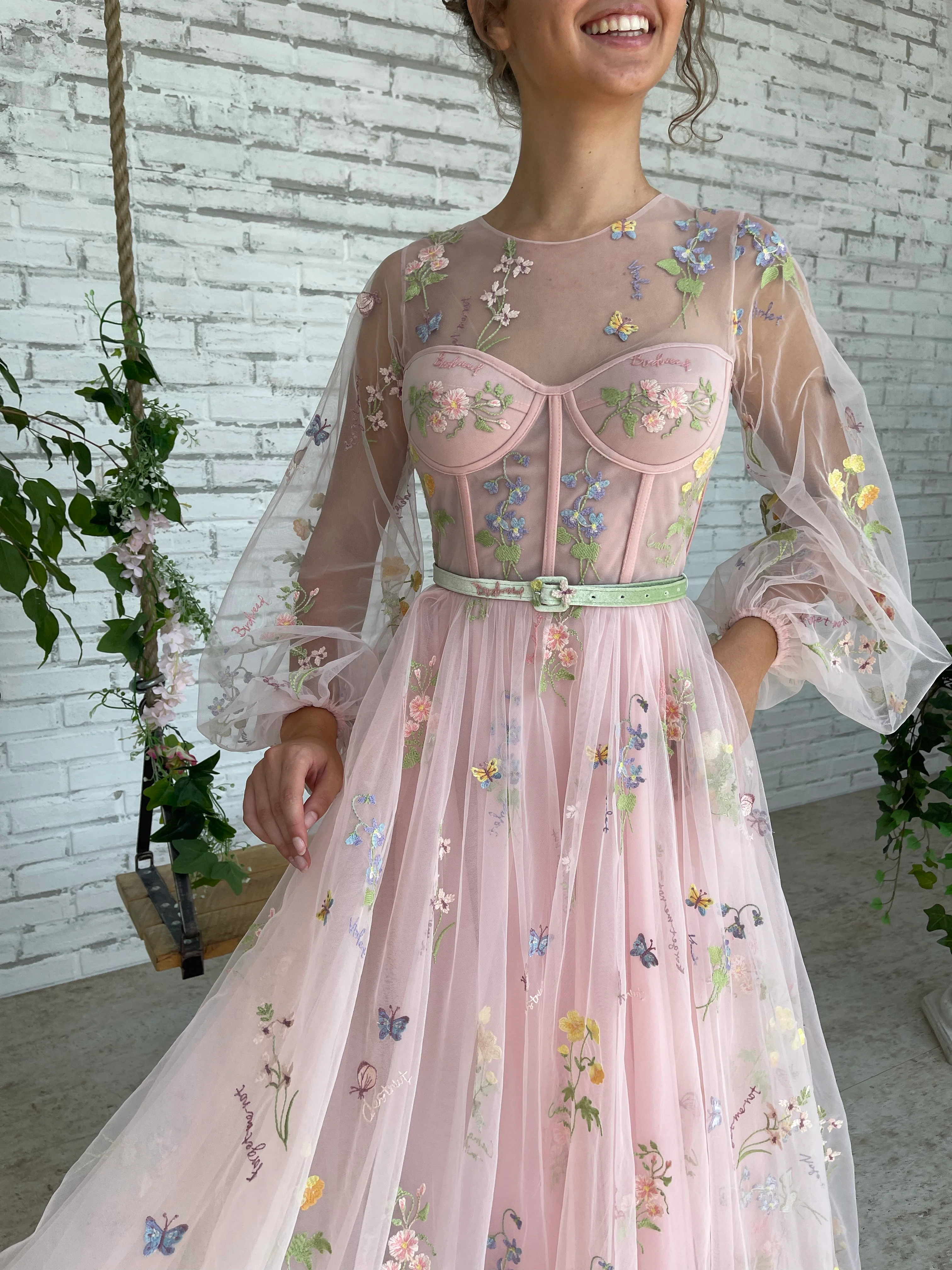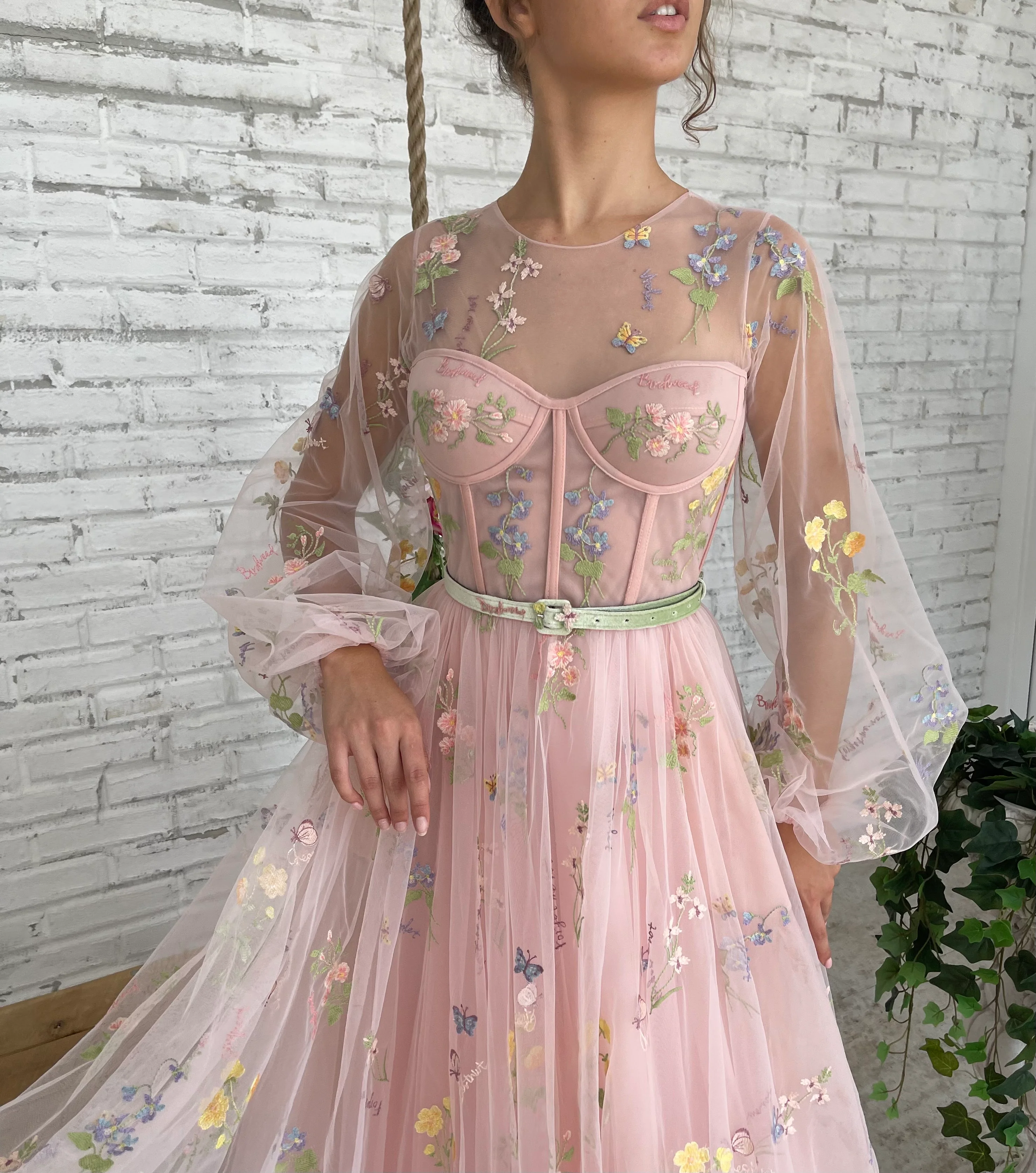Revel in sensorial spring blooms in the Pastel Castle Corset Gown. Dance the delightful day away in sheer layers of pastel pink tulle. Embroidered with flowers and structured with a corset with built-in pads and boning. Leave a trail of baby pink fairy dust behind you in this angelic gown you won’t want to take off.