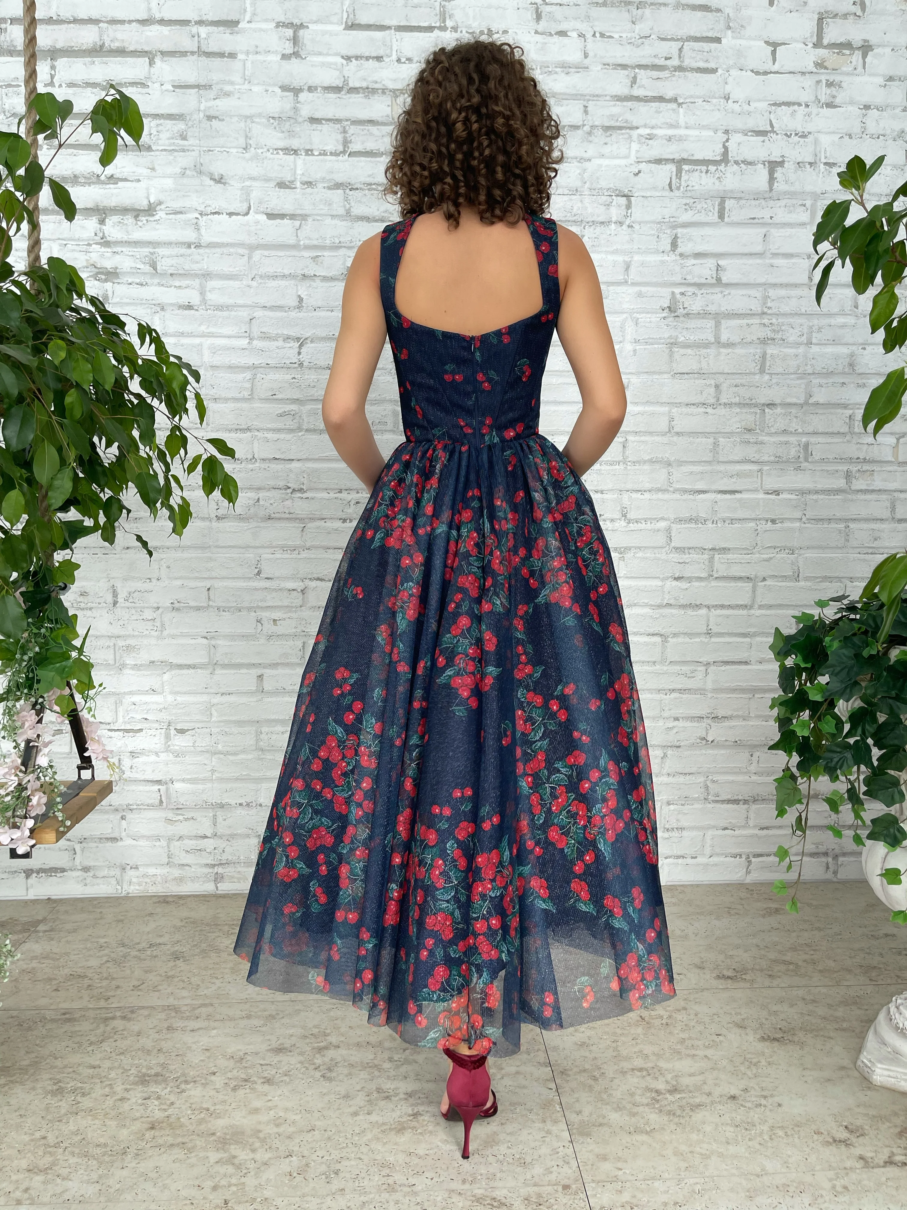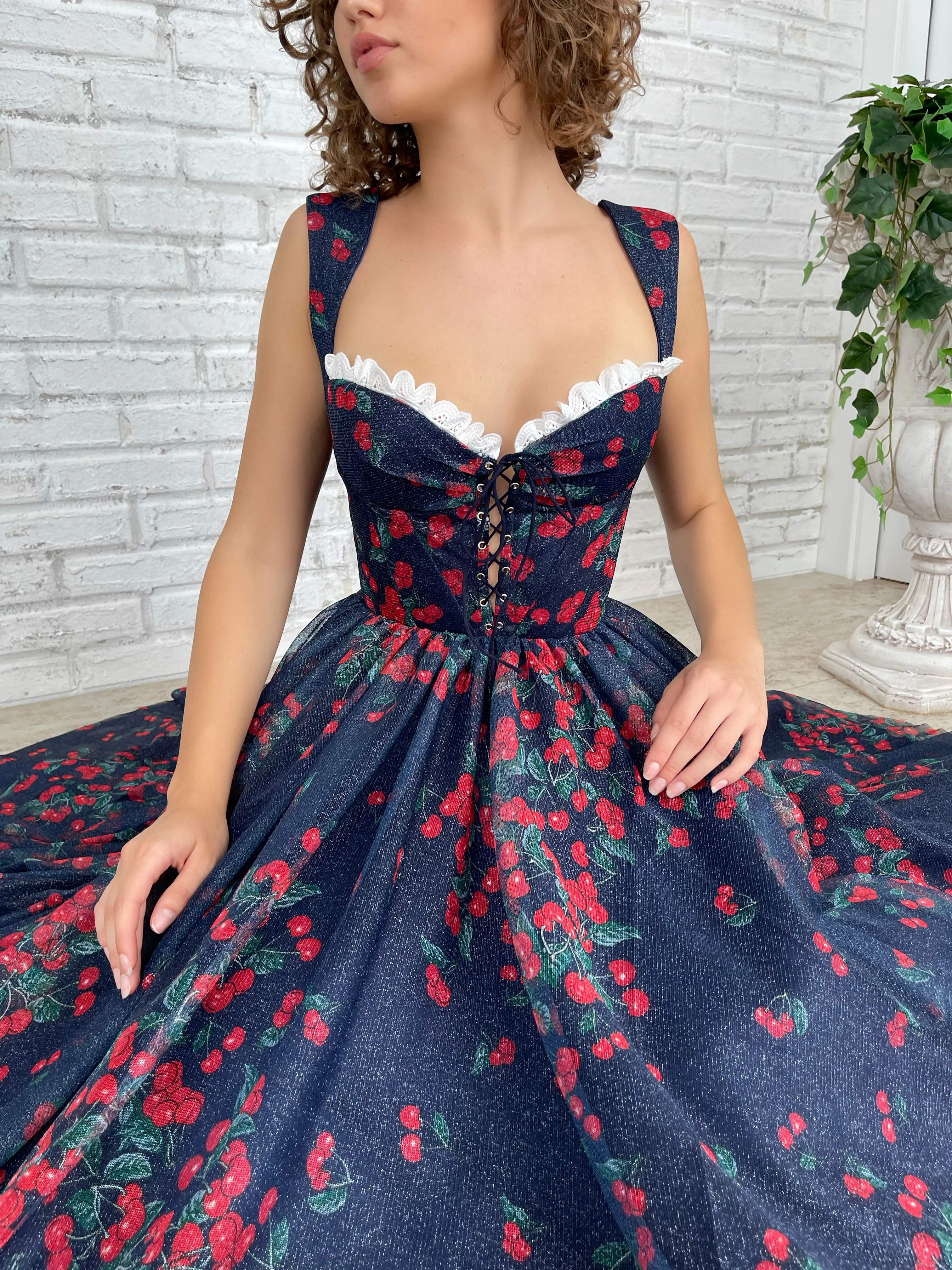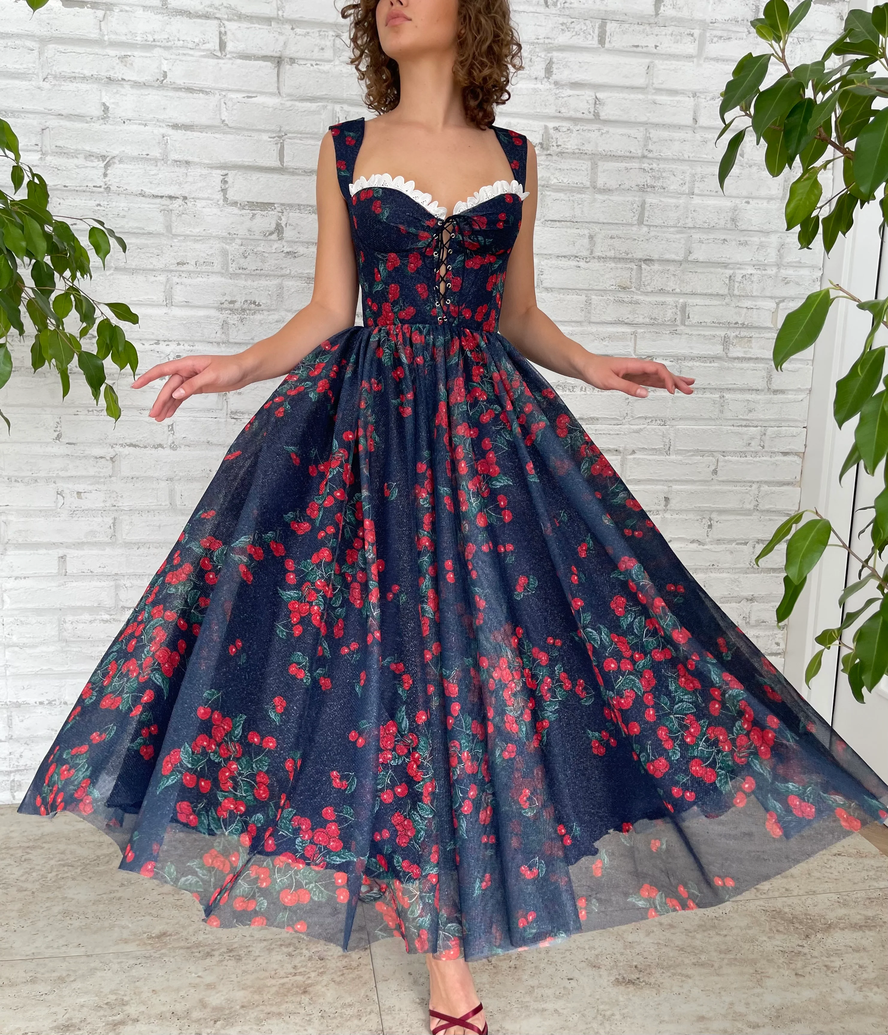 Take yourself out on a nice evening wearing the Midnight Cherry Dress. Paint the perfect picture under the sparkly night sky with dark blue tulle sprinkled with deep red cherries. Find love at first sight and dance the night away until dawn. The perfect dress for the perfect night!