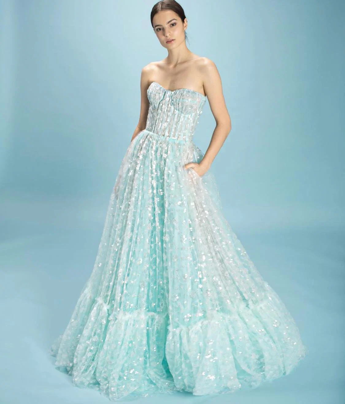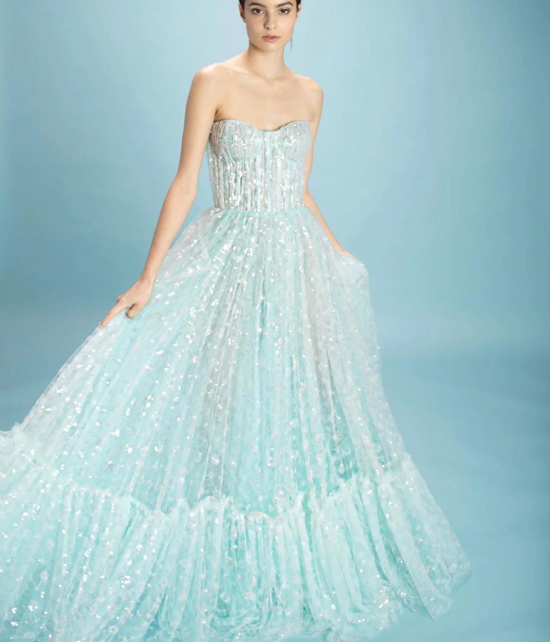 Channel the gorgeous power of a bright aqua hue in the Enchanting Baby Aqua Gown. Featuring tulle covered in an ocean of glimmering white sequins, the bodice is structured as a bustier-style corset while the skirt is a flowing A-line shape with a large ruffle at the bottom.