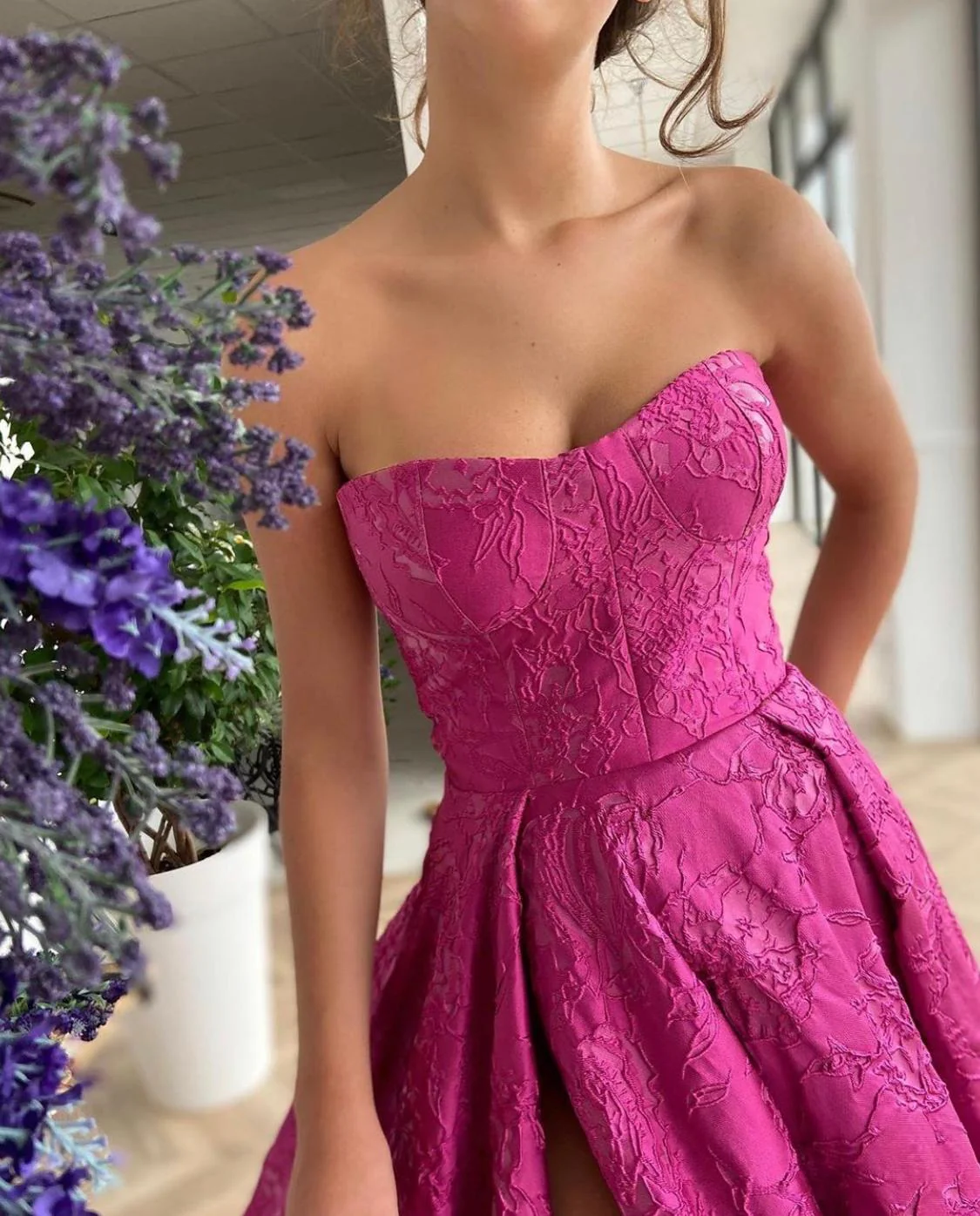 Deep cerise shines in stunning taffeta fabric embossed with floral shapes. The Cerise Amorous Gown is a strapless A-line shape made for ball room dancing and special moments. Opens at the mid-thigh.