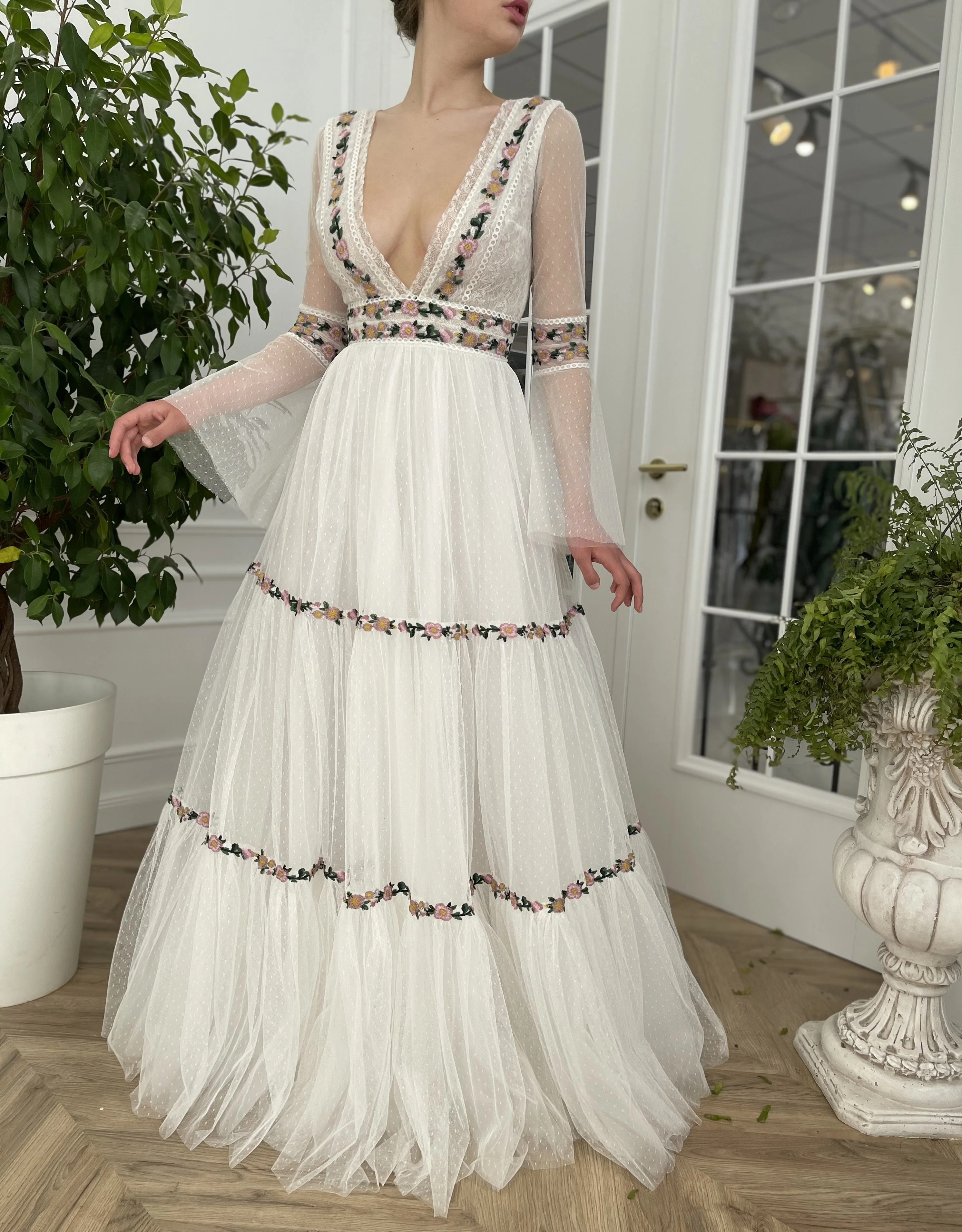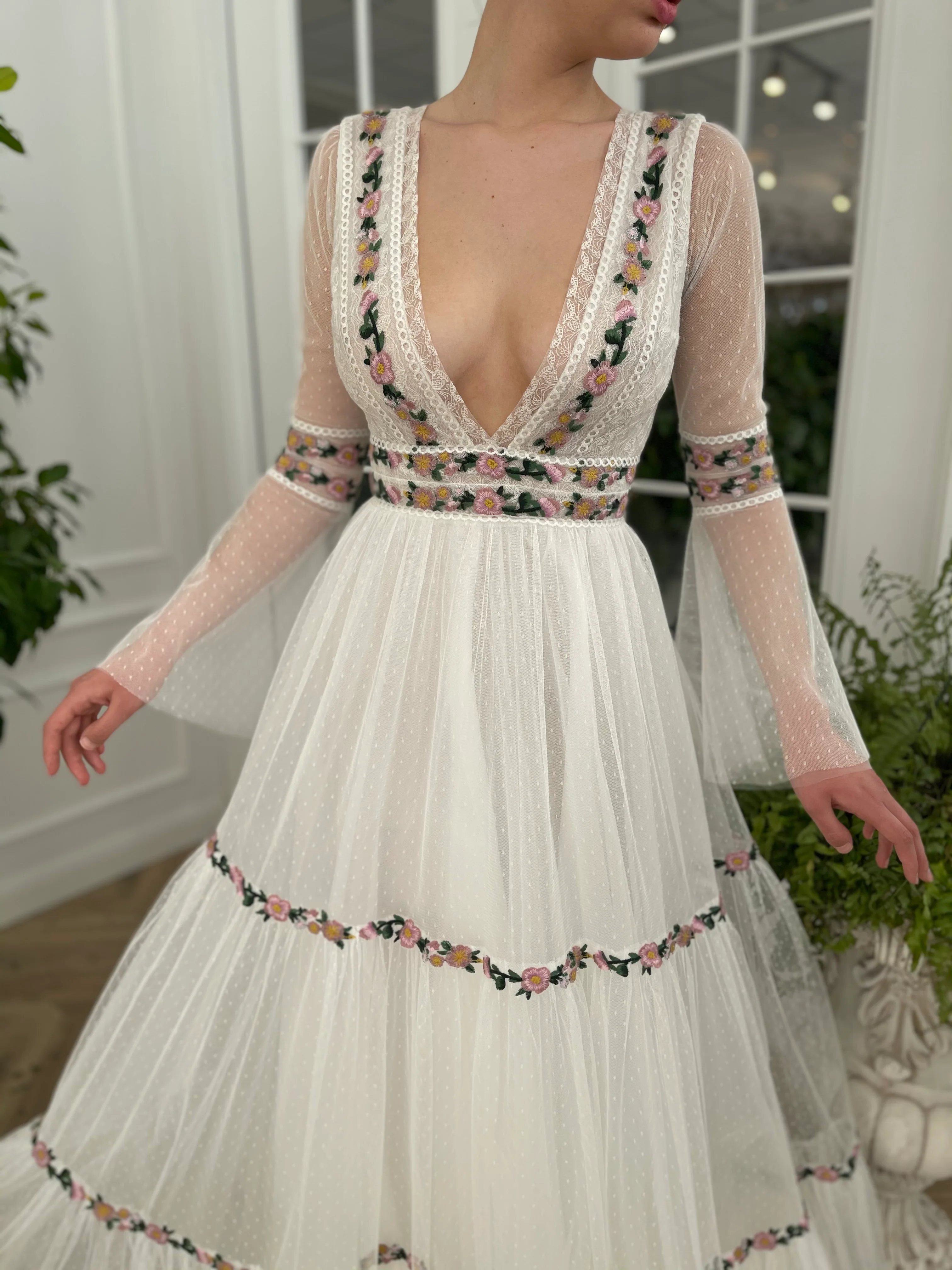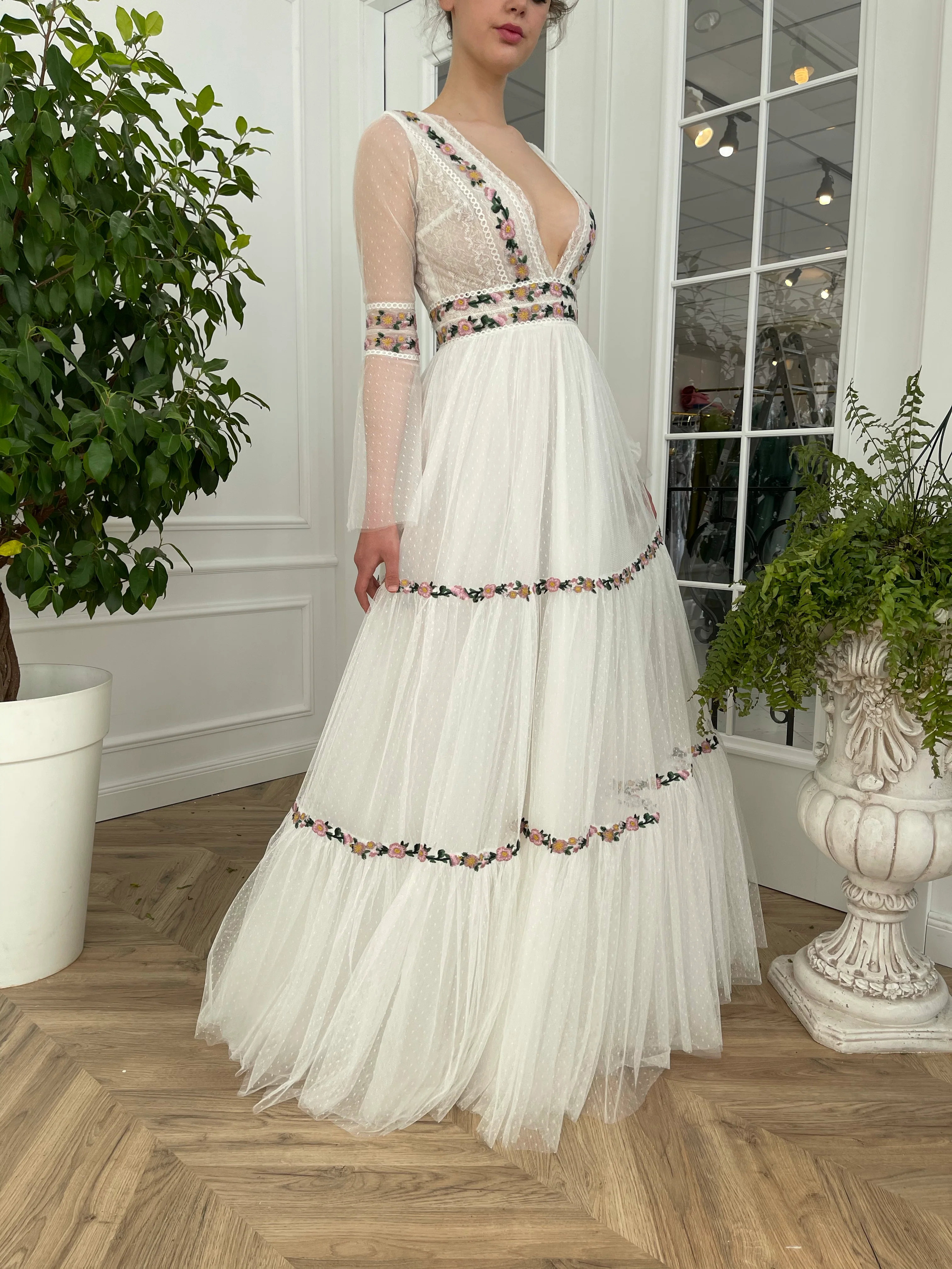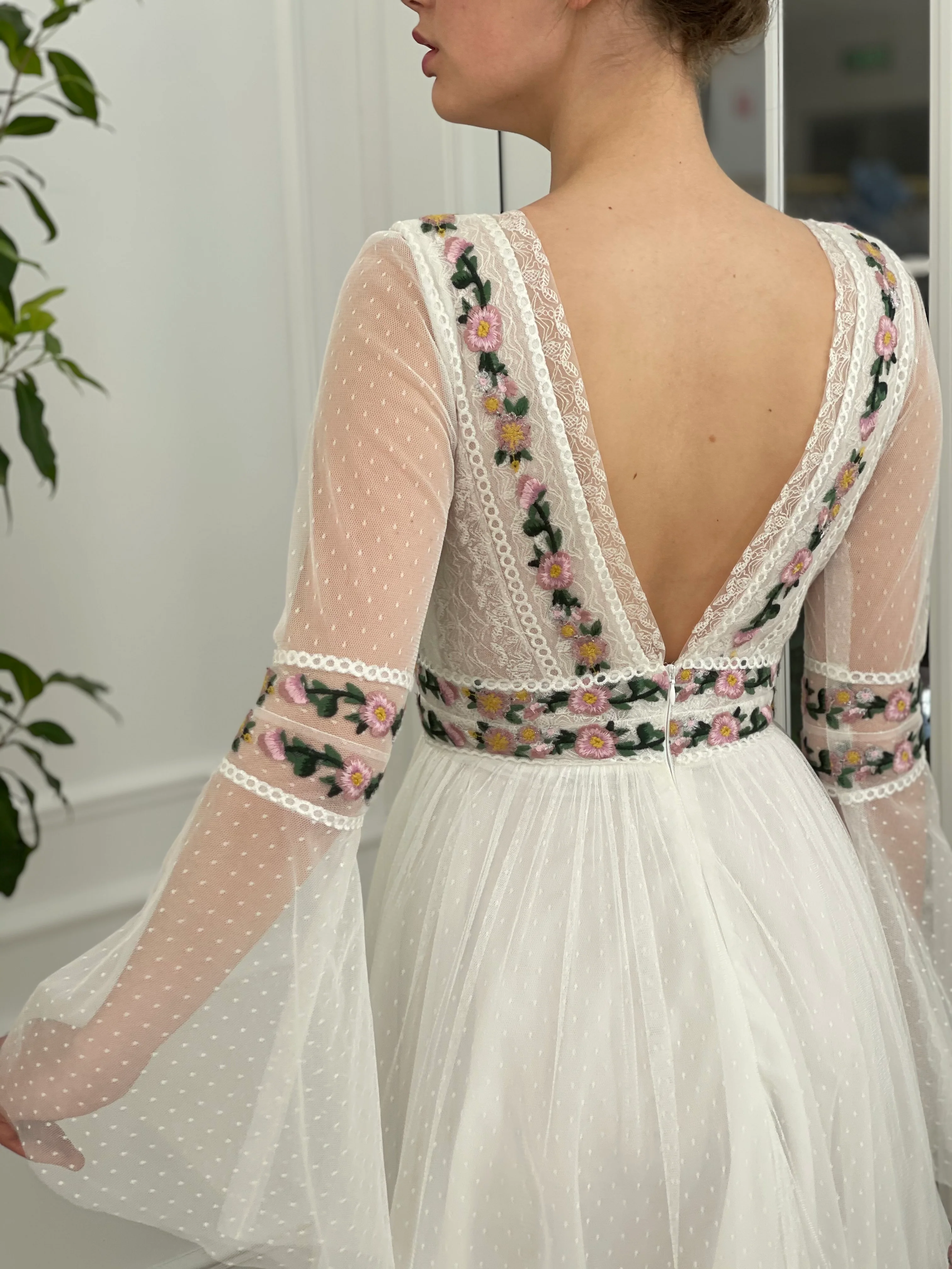 The soft white hue with embroidered rose flowery details, makes for a perfect whimsical wedding gown.