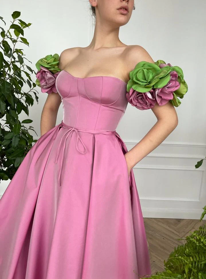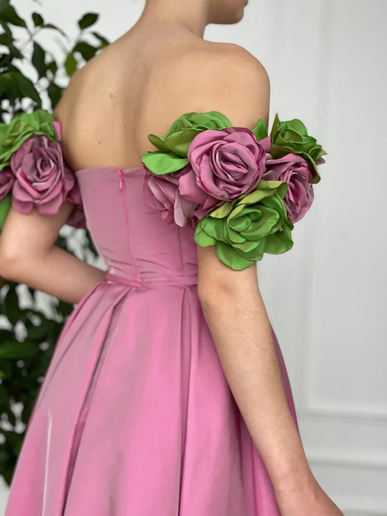 -Embroidered off shoulders pink or green-pink flowers