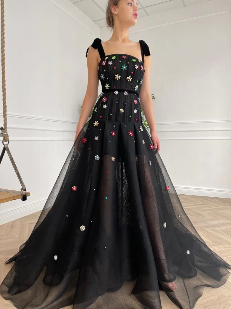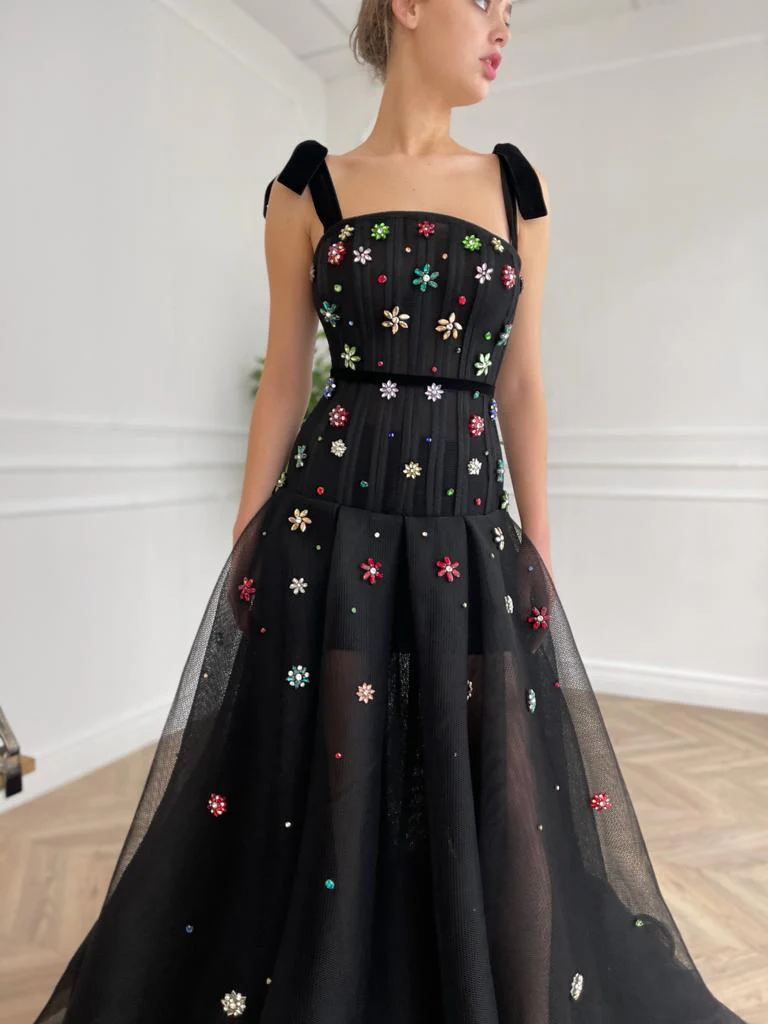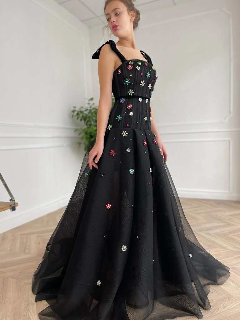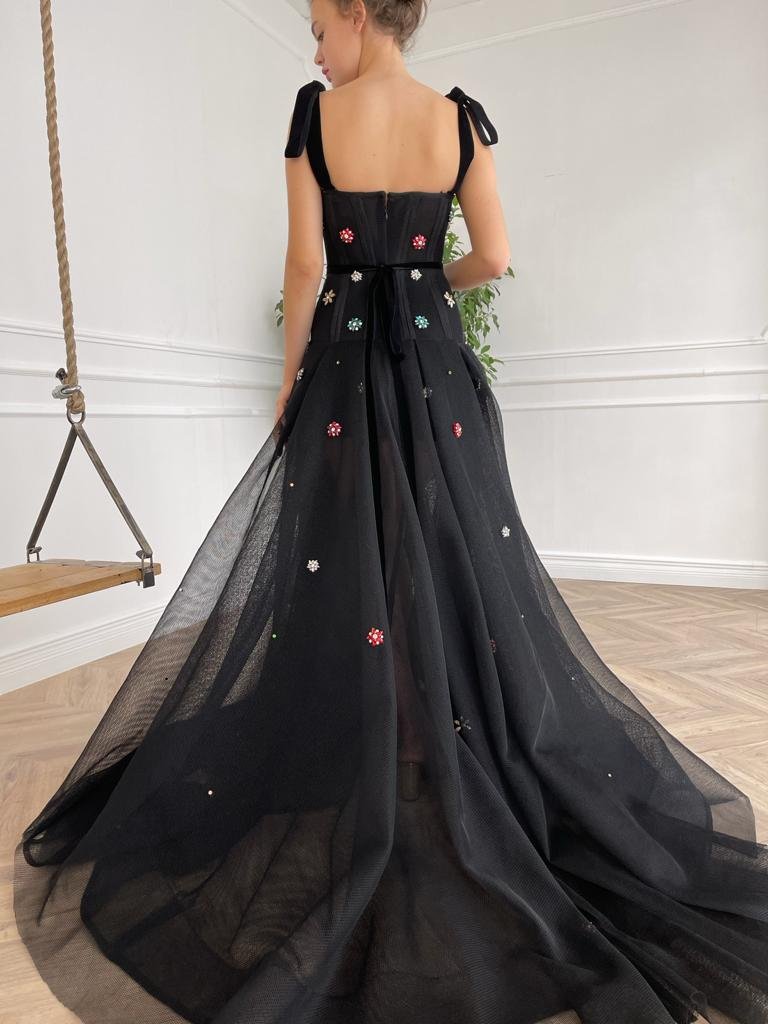 -Black colored fabric and multi colored embroidery