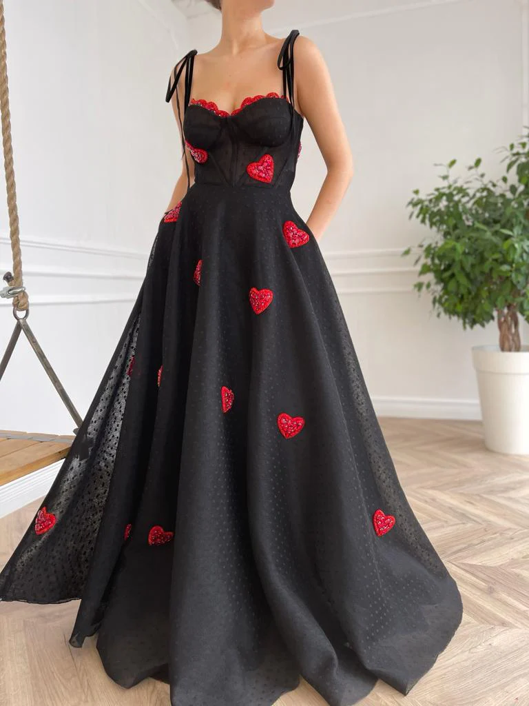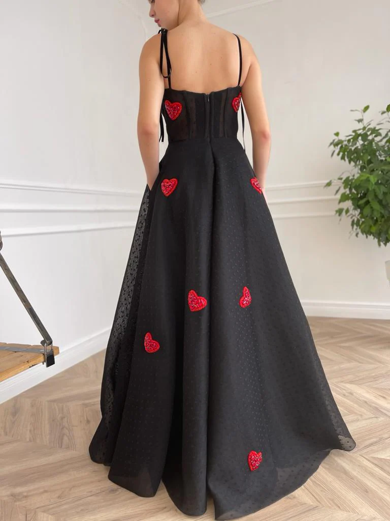 -Black colored fabric with red embroidered hearts