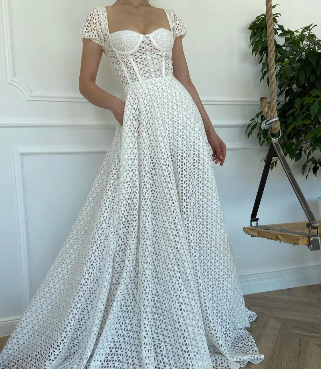 -A-line with buttoned, corseted top, shoulder sleeves and waist definition