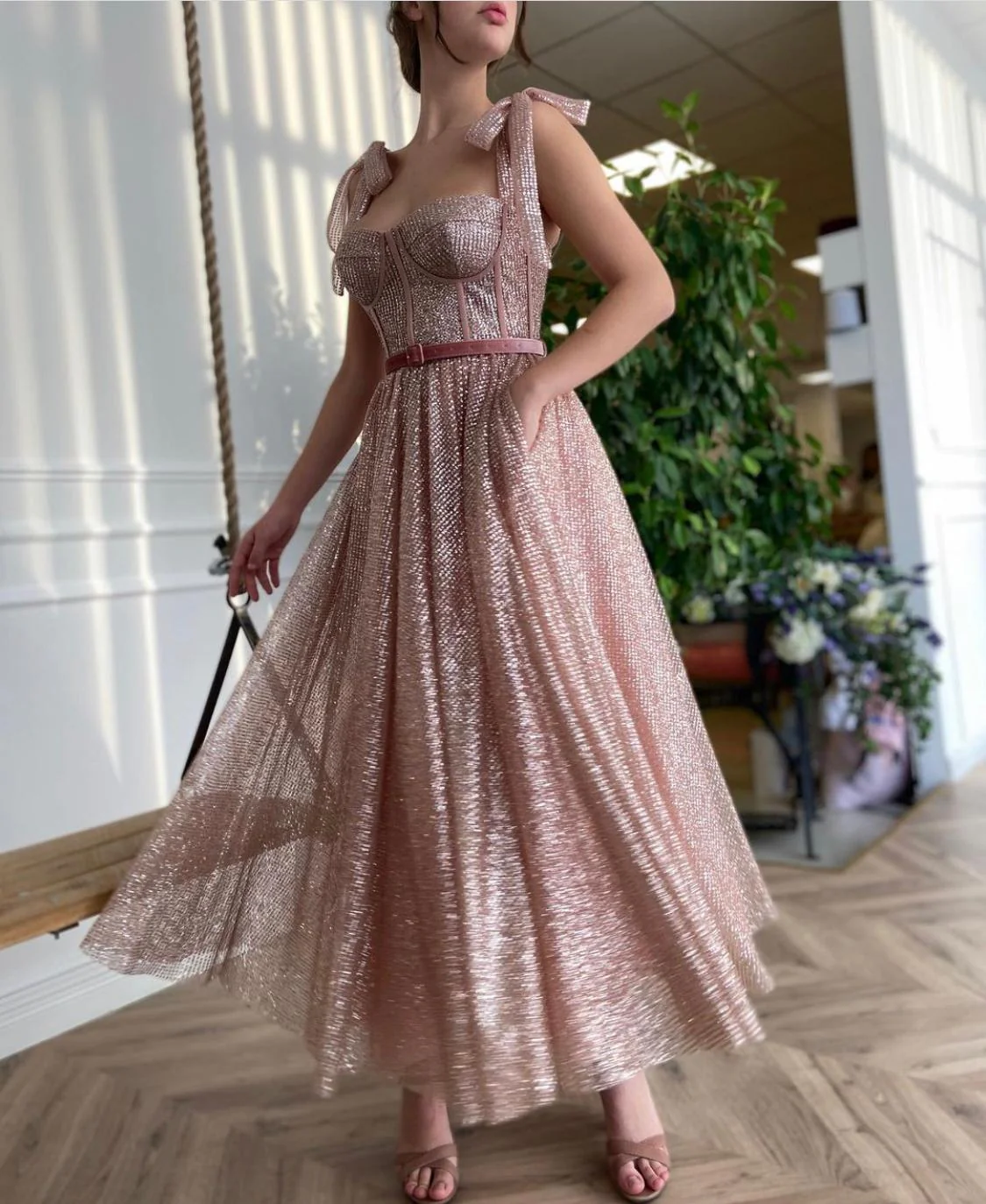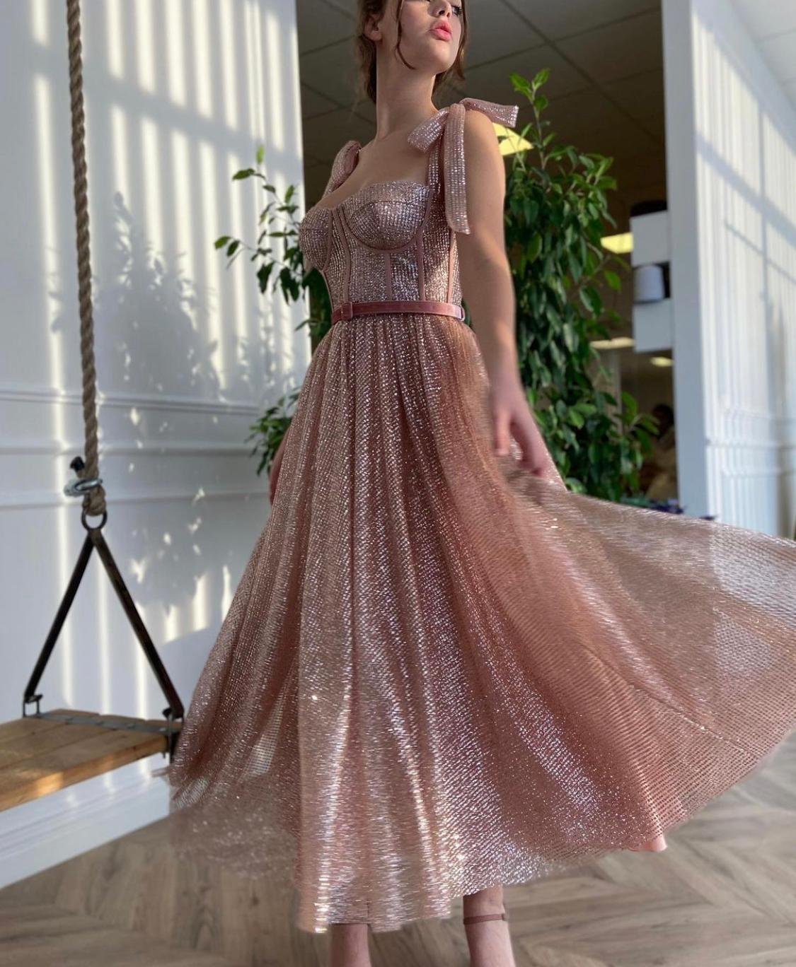 -Tea length style with decorative straps