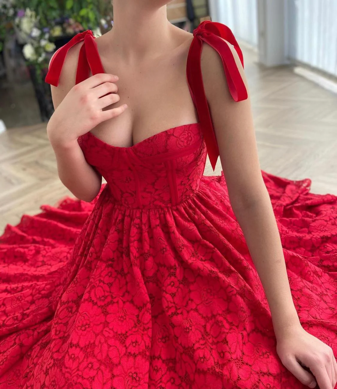 -Tea-length style with bustier corset and decorative straps