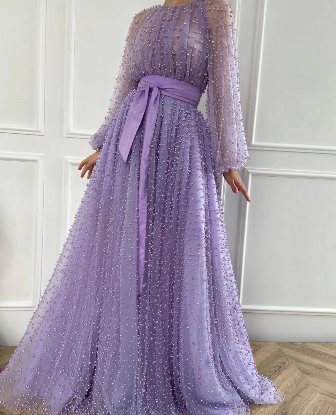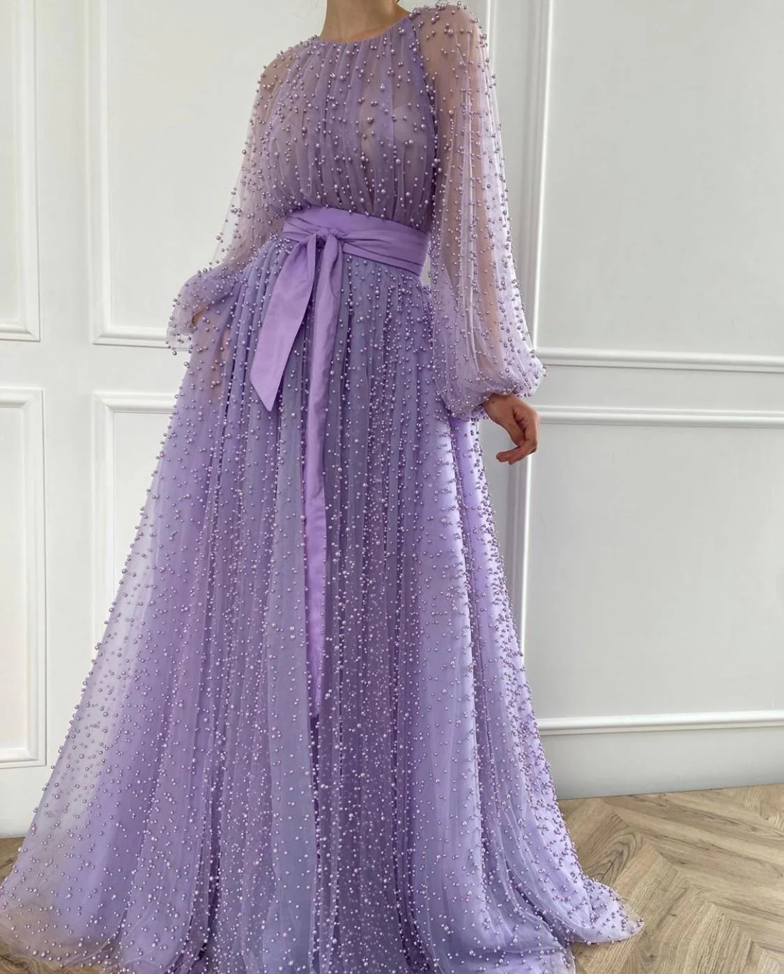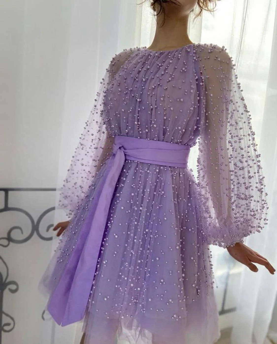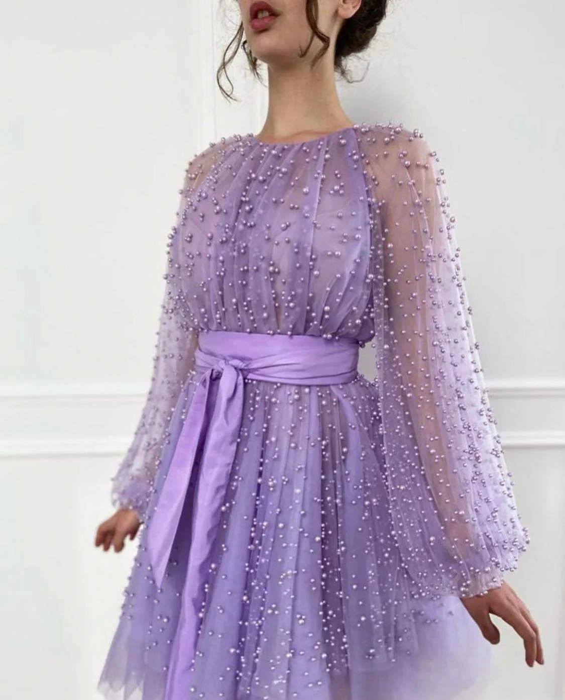 Teuta Matoshi’s classic pearlescent beaded gown in a new, shorter silhouette. The Shiny Purple Beaded Gown is covered in a sea of thousands of lilac shimmering pearl-like beads. With sheer sleeves, a mini length and a waist defining belt.Sheer sleeves and high neckline.