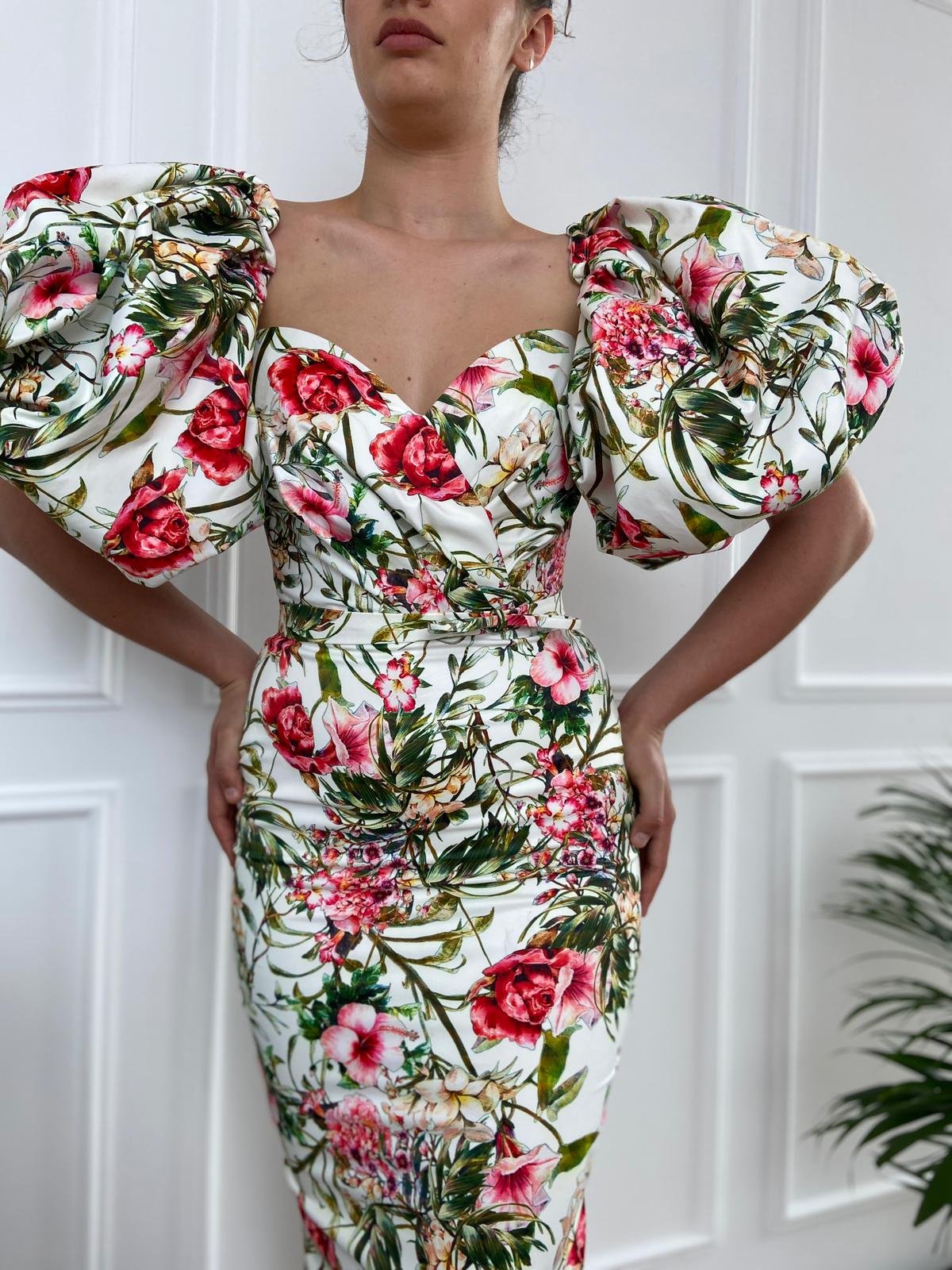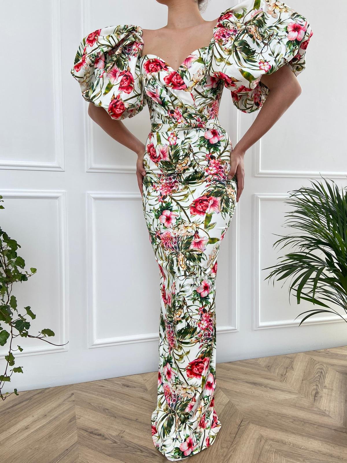 High-volume puff sleeves will have your dreaming of lush tropics. The Daydream Flower Patterned Mermaid Gown is a bold silhouette rendered in floral patterned taffeta fabric. Mermaid style bodycon shape with oversized sleeves.