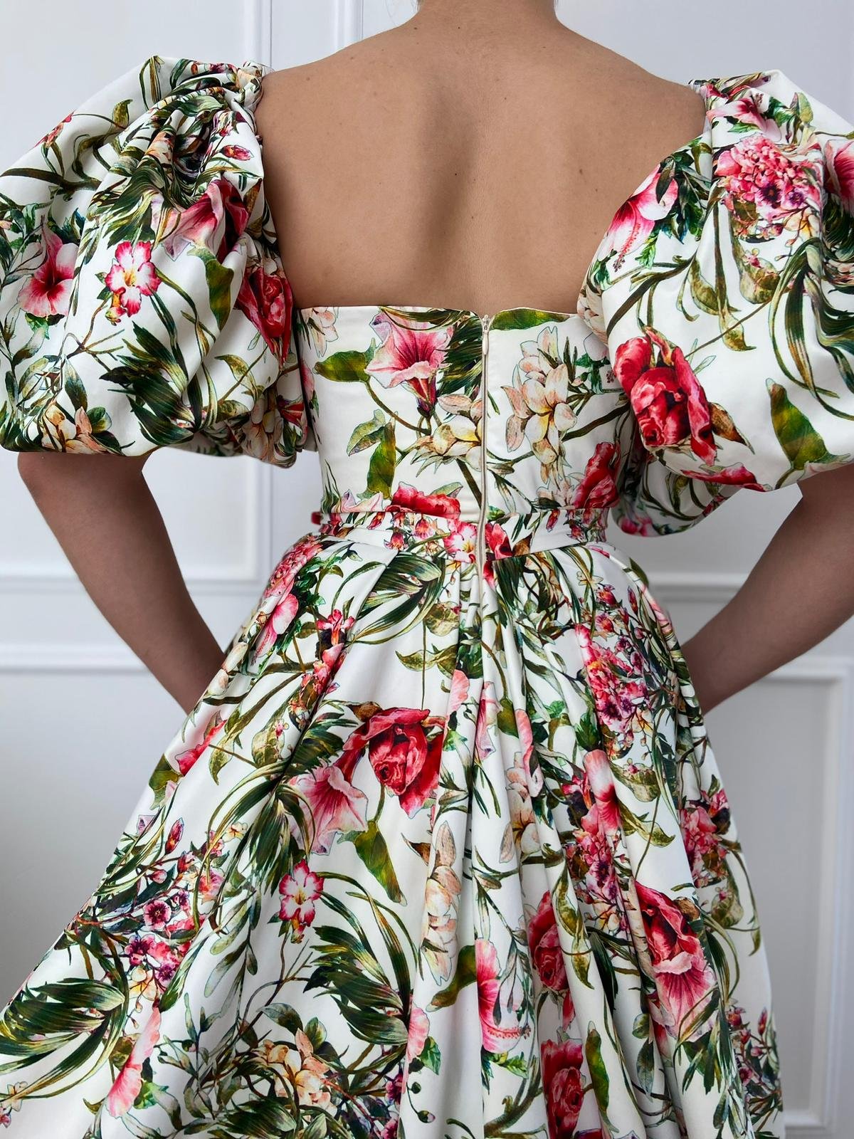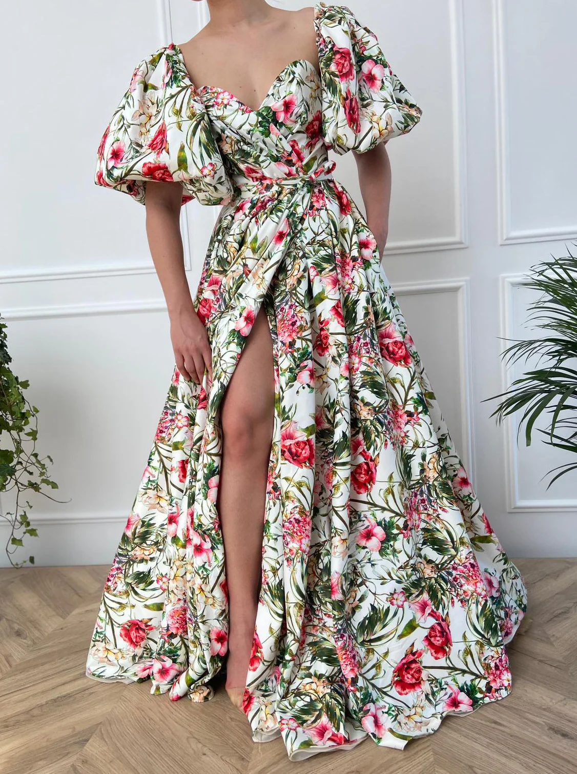 Have you ever daydreamt about running through an enchanted garden? The Daydream Flower Patterned Gown was made of garden time tea and floral-tinged adventures. Made of floral taffeta with oversized puff sleeves, the A-line silhouette is nipped at the waist, while the floor-length skirt opens high at the thigh.
