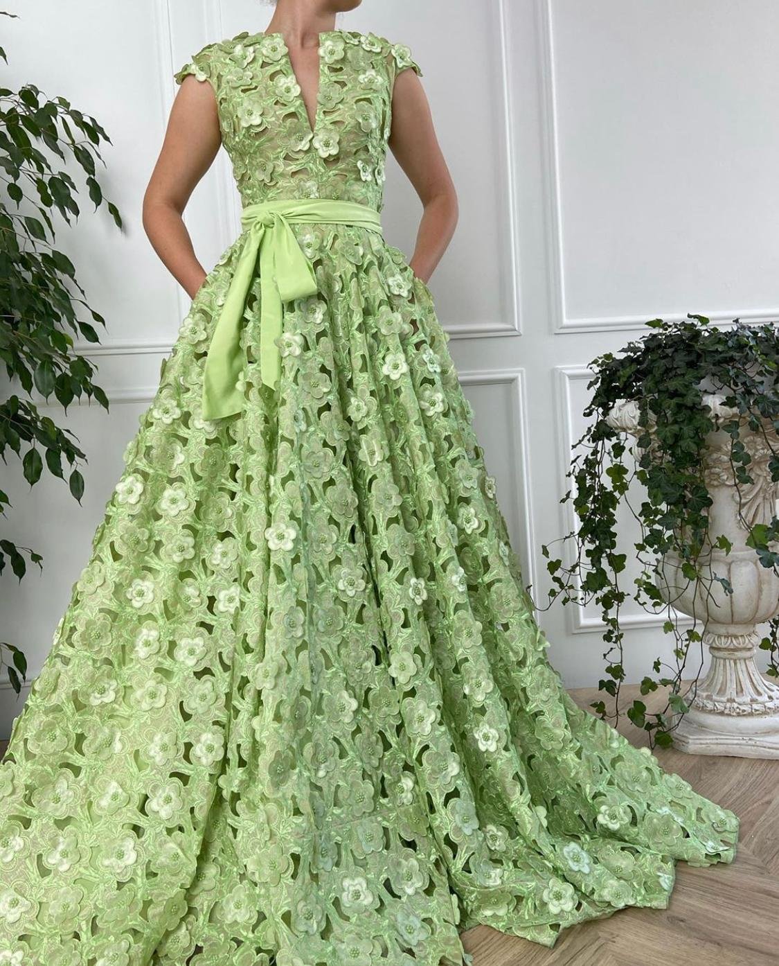 Fresh spring air and blooming flowers in the form of a gown. The Spring Blossom Lace Gown is made of delicate mint green lace cut with hundreds of colors. The flattering A-line silhouette comes with a fabric belt. Floor length.