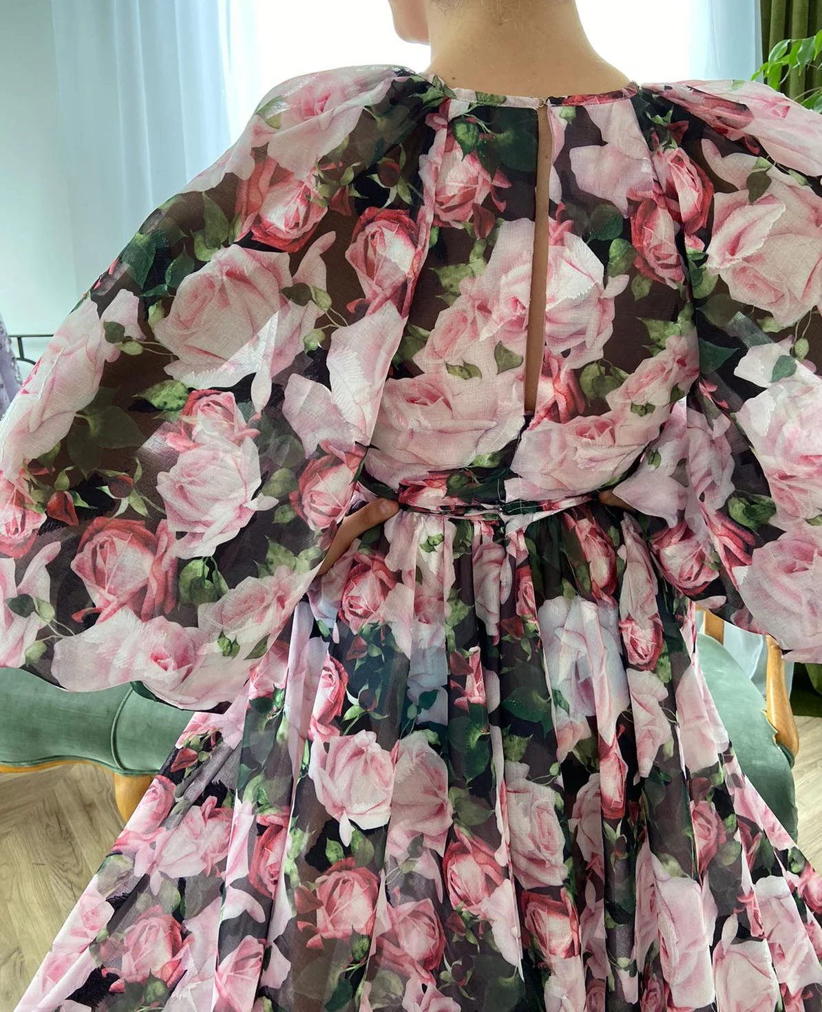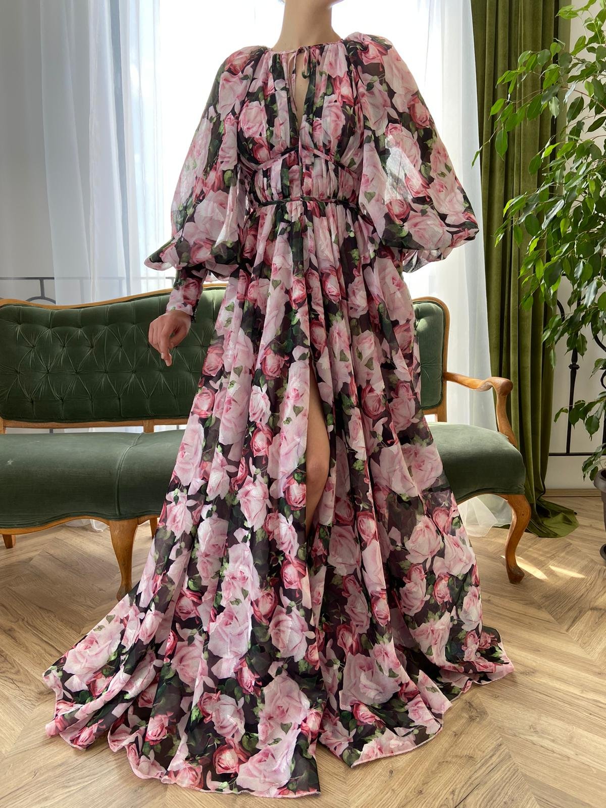 A celebration of one of the most iconic flowers of all time. The Roses Essence Gown is a blossoming chiffon gown with an A-line silhouette and thigh-high slit. Long, sheer puff sleeves with a structured bodice for a defined waist.