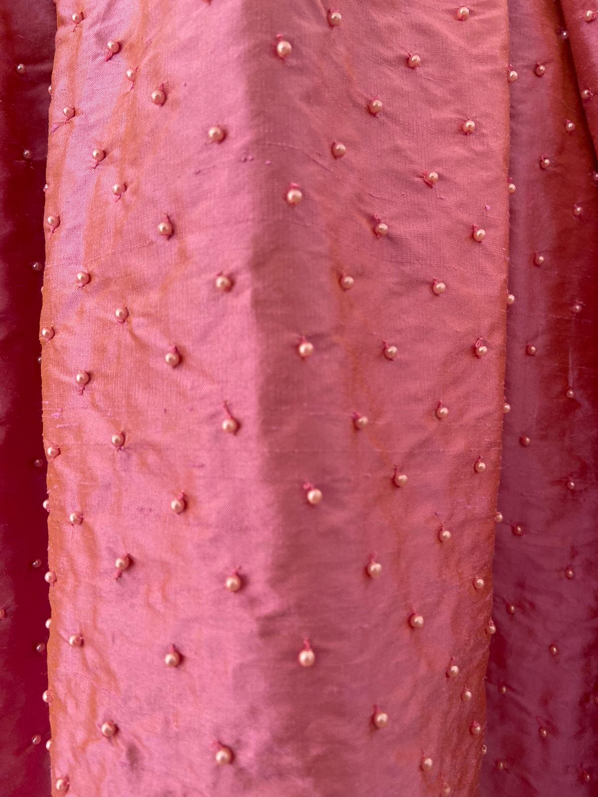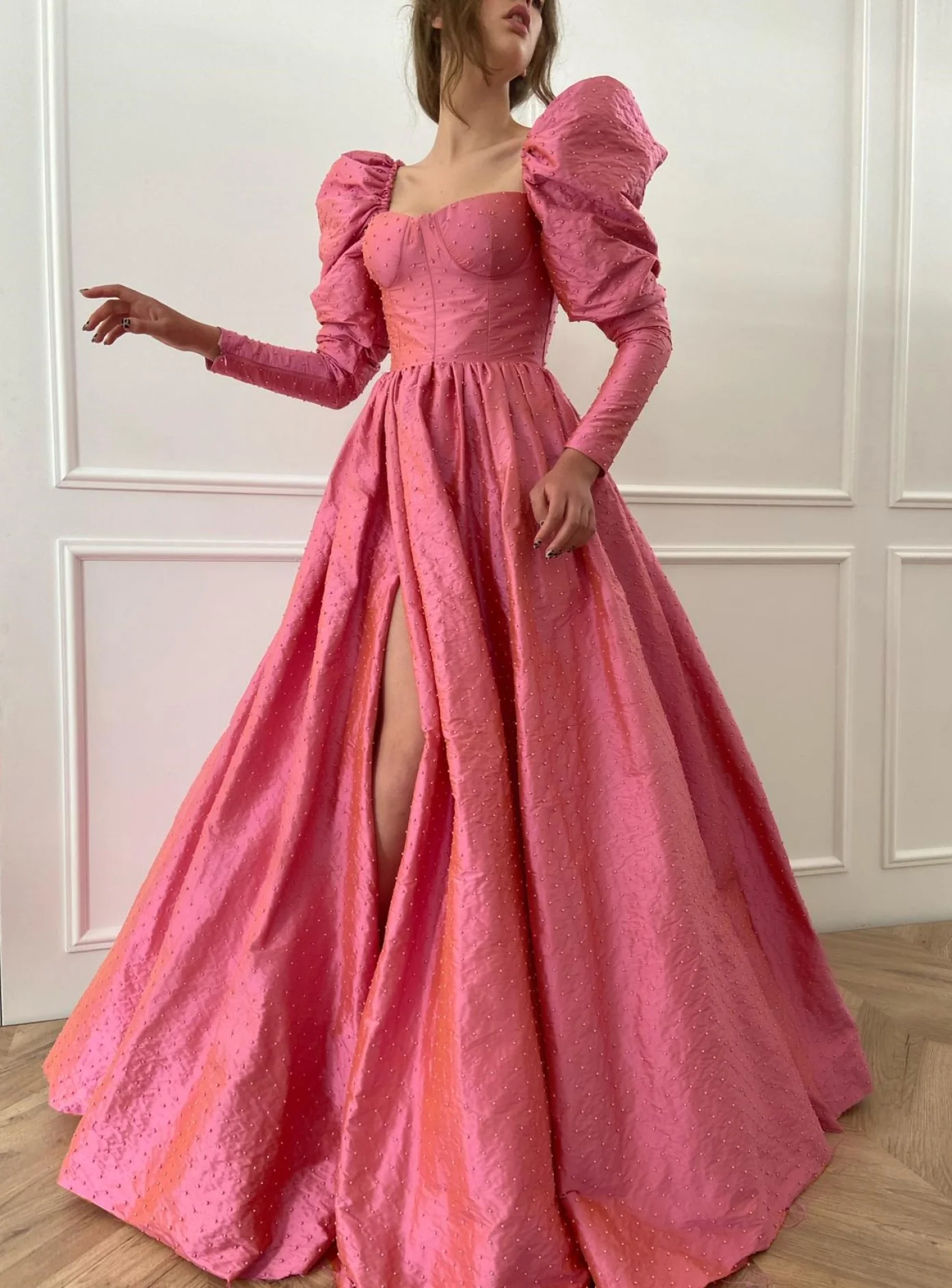 The rolling waves of a pink sea bring you in, with thousands of pretty pearls. The Pink Sea Pearls Gown is a candy pink color gown cut in the style of a princess dress. Beaded taffeta fabric with an A-line silhouette, puff, sleeves and an open skirt. Open at the thigh.