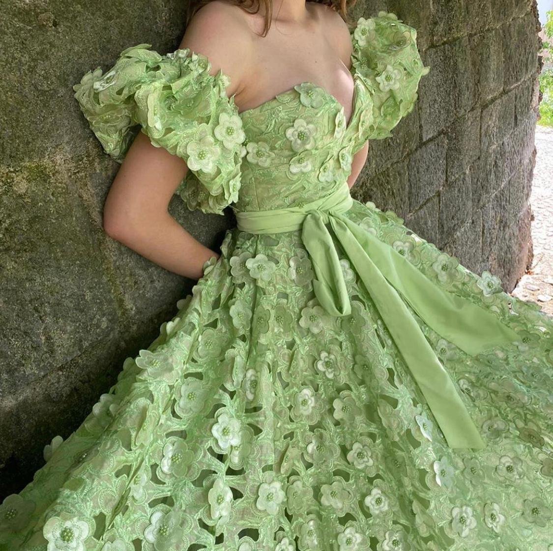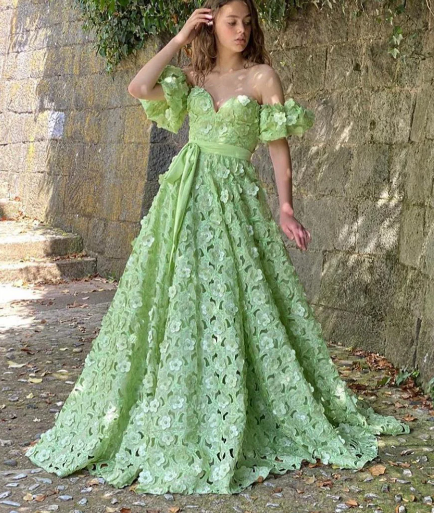 Spring flowers blossom under the dappled sunlight of a Mediterranean vacation. The Spring Blooms Lace Gown is a romantic style for wild hearted lovers. Hundreds of 3D cut flowers sit on the surface of the mint green lace, with an A-line silhouette that defines the waist. Finished with a fabric belt. Floor-length with off-the-shoulder sleeves