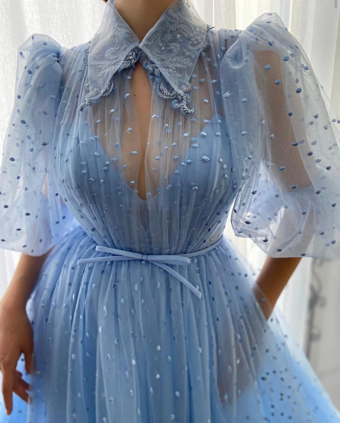 The illuminated sky in the form of a dress. The Celestial Dots Gown is made of a beautiful Swiss dotted tulle fabric. A structured collar with lace makes a statement. Sleeves and upper bodice are sheer, while the A-line silhouette comes belted with a pretty sky blue bow.