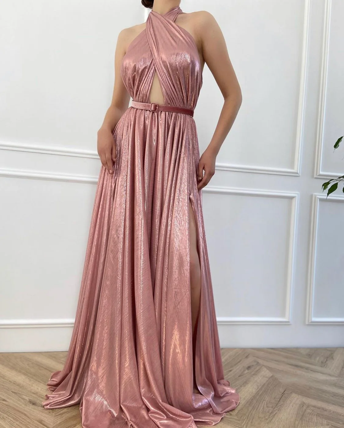 Inspired by the luxe and easy shapes of the glamourous 1970s, the Candy Glimmer Gown is rendered in a beautiful Tuscan pink lamé fabric. Halter-style top warps around the shoulders for a peekaboo affect at the waist. Belt for waist definition and open at the thigh