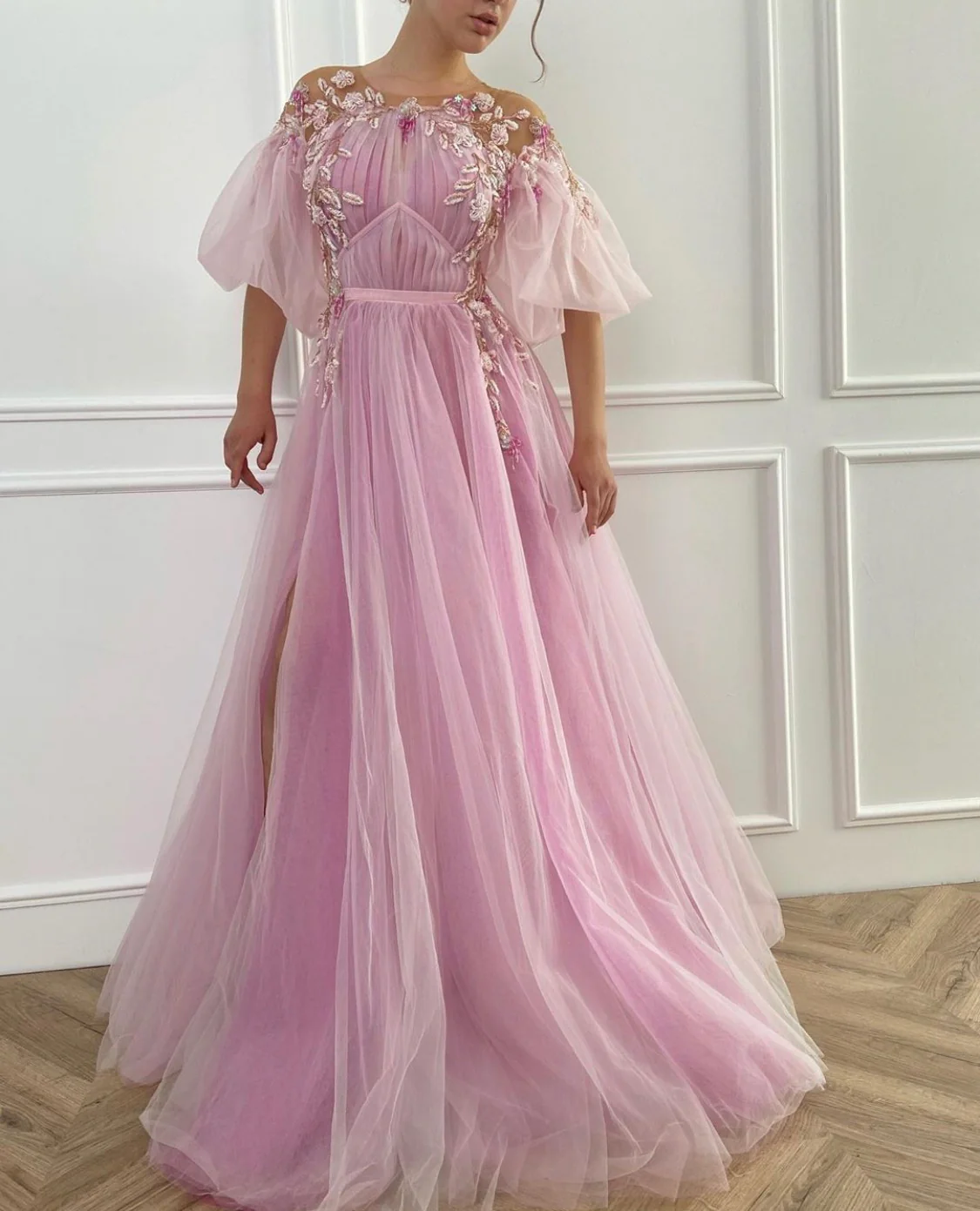 Dream in shades of vivid pastels in the Charming Pastel Gown. Made of tulle fabric and embroidered embellishments, this gown is cut in an A-line shape with sheer sleeves and a structured bodice. Finished with a waist-defining belt.