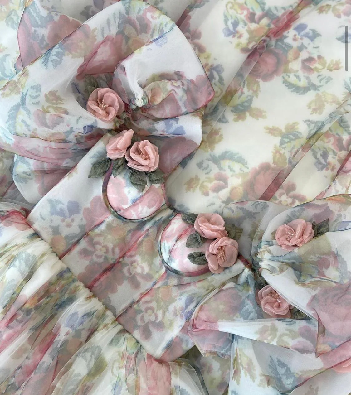 Enter a magical, fragrant rose garden in the Ethereal Roses Gown. Printed blossoming tulle fabric is weightless with volume. Cut in an A-line shape with a corset style busier and embellished roses at bodice and on the sleeves. Sheer off-the-shoulder puff sleeves. Open at the thigh.