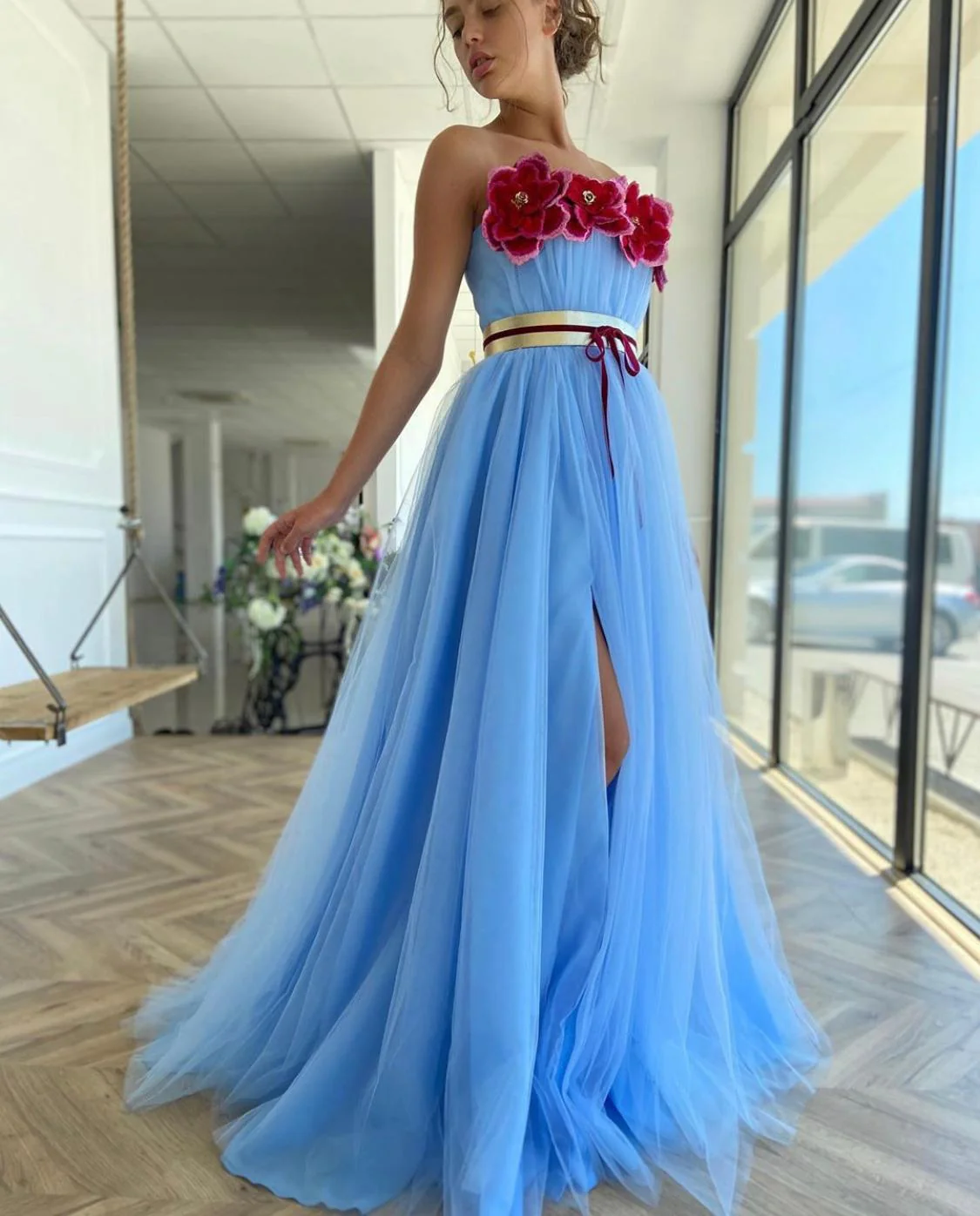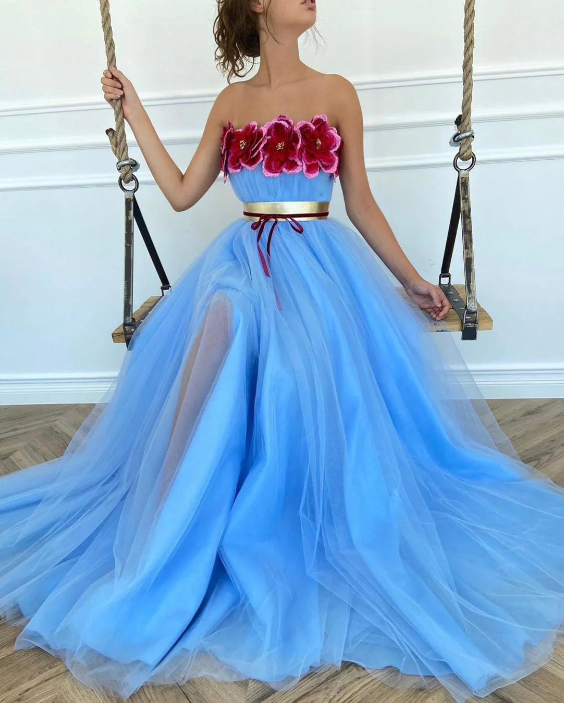A garden of beautiful blossoms emerges from the Floral Wonderland Gown. Made of tulle fabric with embroidered flowers at the bodice. Bright blue, burgundy and gold unite for a whimsical feel. Cut in a flattering A-line silhouette with a belt at the waist. Opens at the thigh.