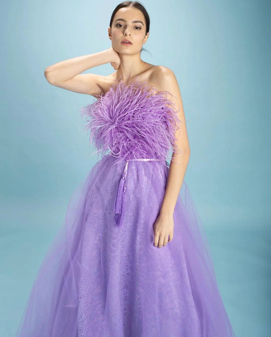 Daydreaming comes easy in the Daydream Feathered Gown. Inspired by old world glamour, a puff of delicate feathers punctuates the bodice of this sleeveless gown in a whimsical shade of vivid lilac. Complete with a skinny, sash-style belt, the chiffon skirt flows in the breeze.