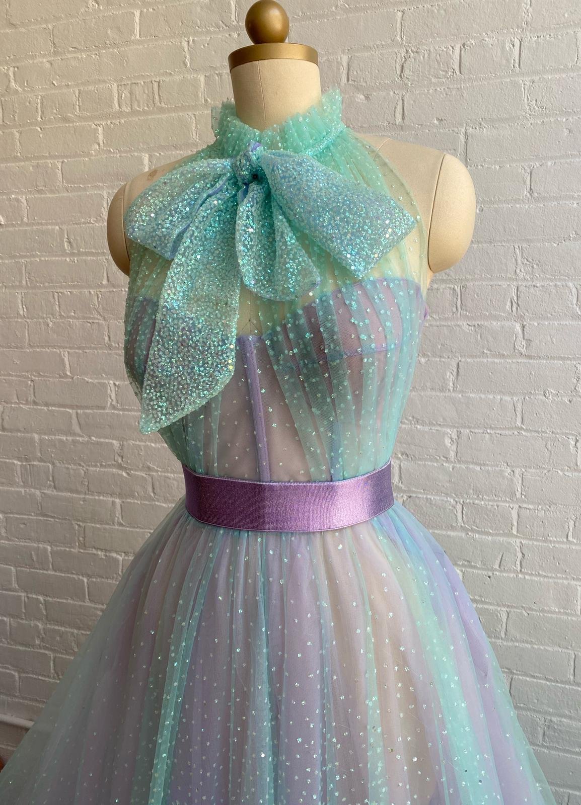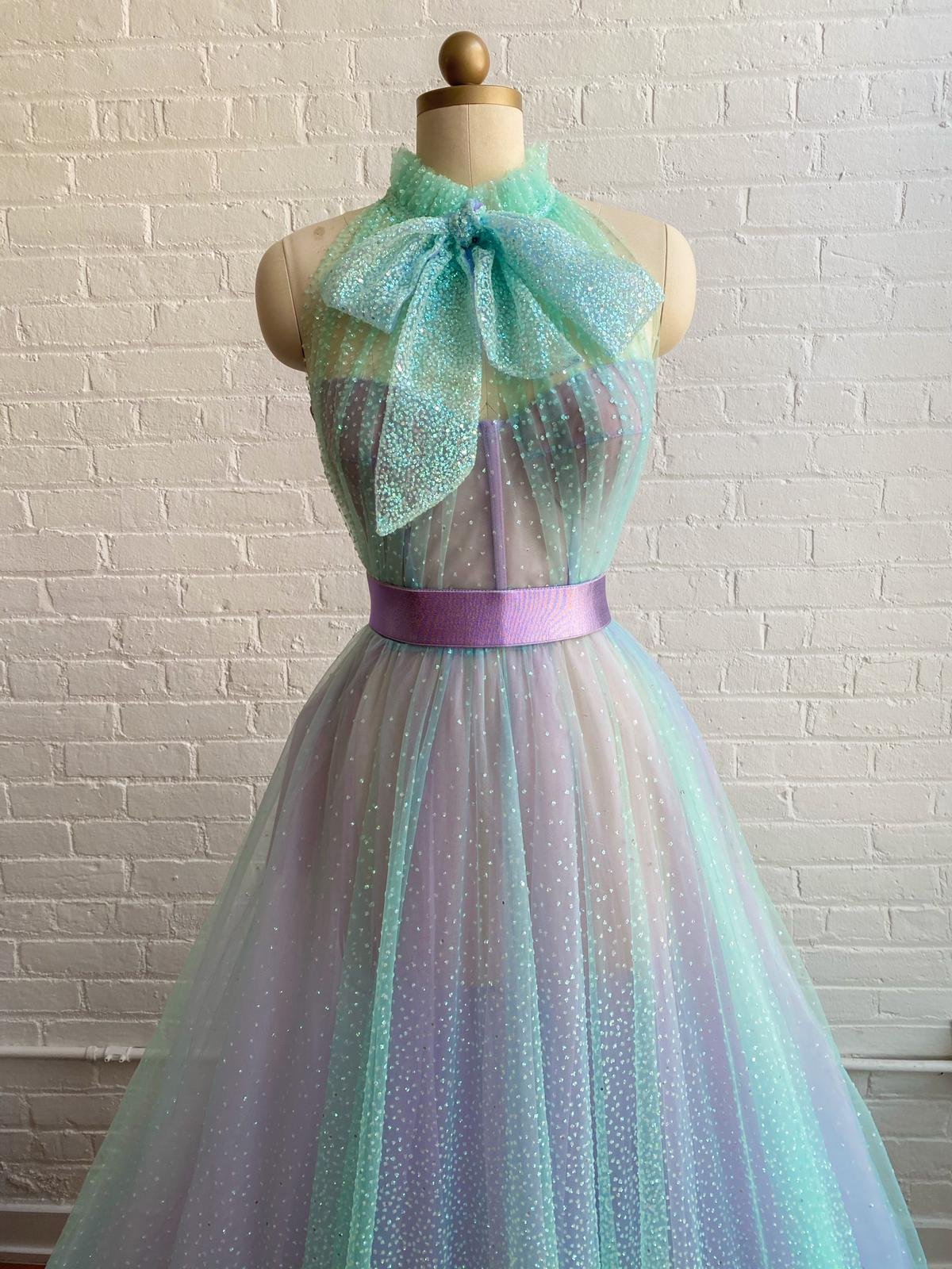 Glitter down the sidewalks or on the ballroom floor in the Powder Gown. Featuring glittery, iridescent fabric, you’ll shine like a diamond in this lilac and mint green gown. Finished with a bow at the neckline and a satin-y belt to cinch the waist.