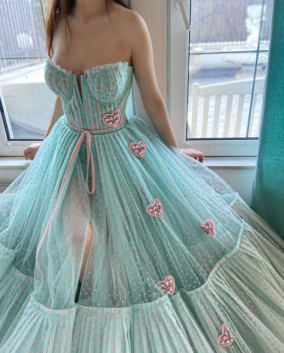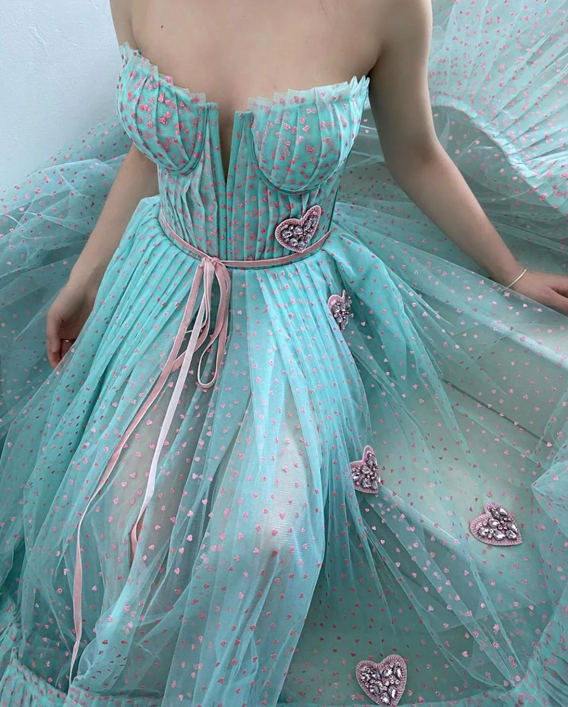 Hearts sing in the whimsical Hearty Sonata Gown, which is constructed of pink Swiss Dot printed aqua tulle. Handmade, gem-encrusted hearts cover the base of the gown, with a pleated bustier top finished with a pink velvet sash.