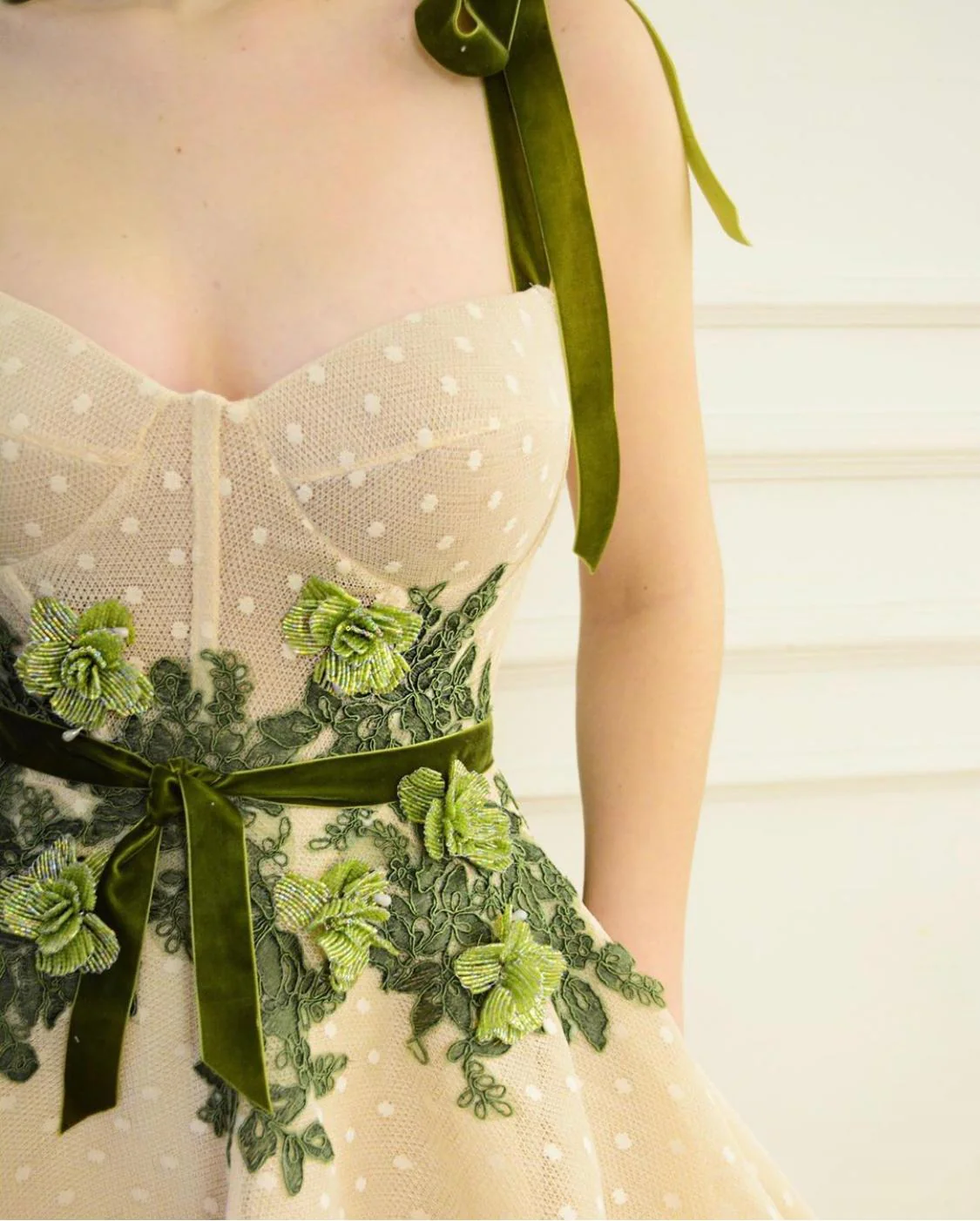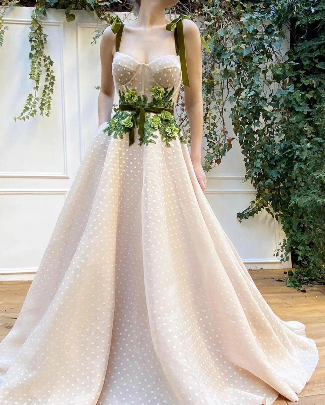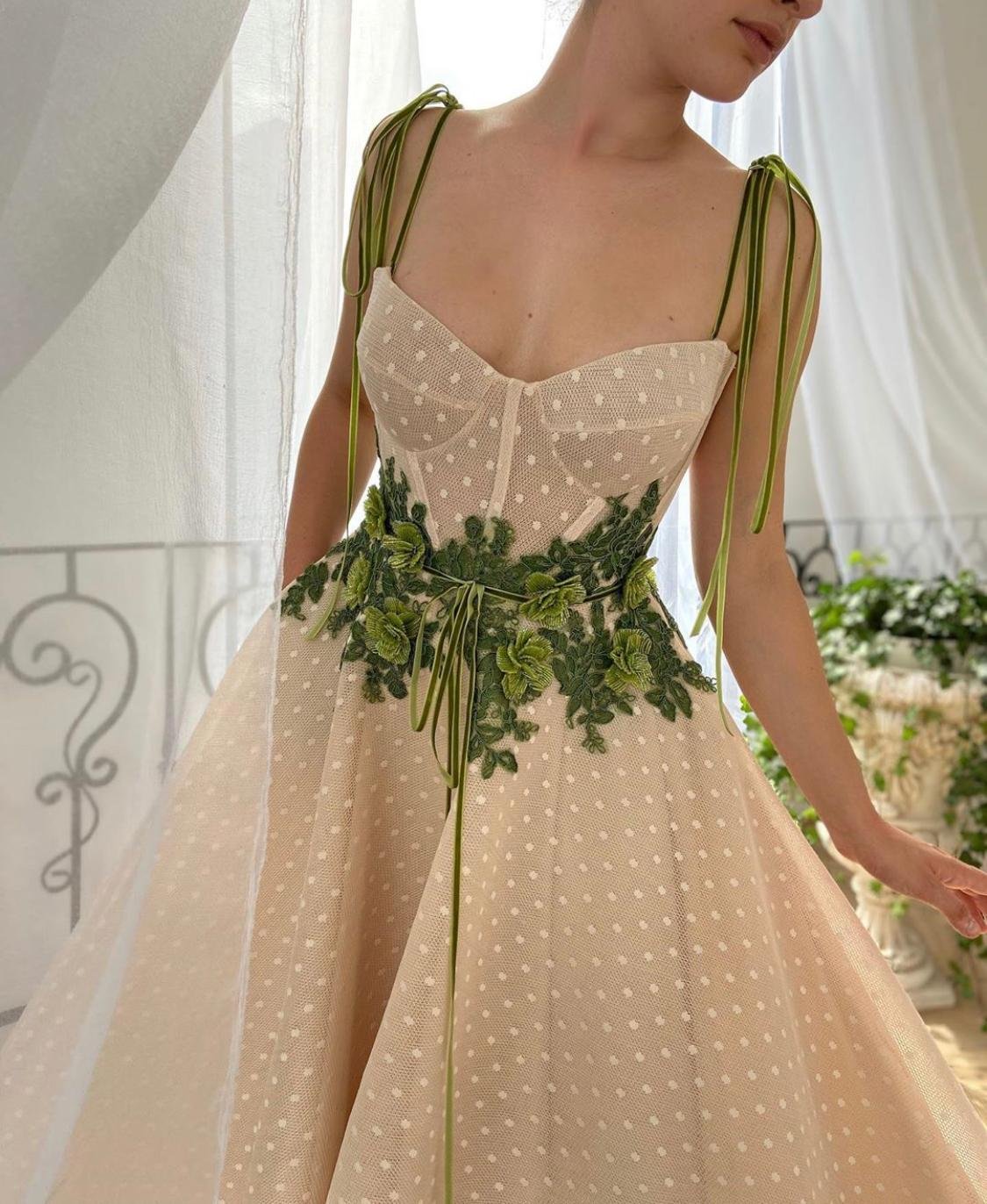A dash of greenery comes alive on the Dotted Moongaze gown. Featuring nude tulle covered in a forest of dots, the waist presents a blossoming embellishment of green leaves and flowers. The bodice comes in a bustier shape and the gown is finished with lush velvet shoulder straps and a sash.