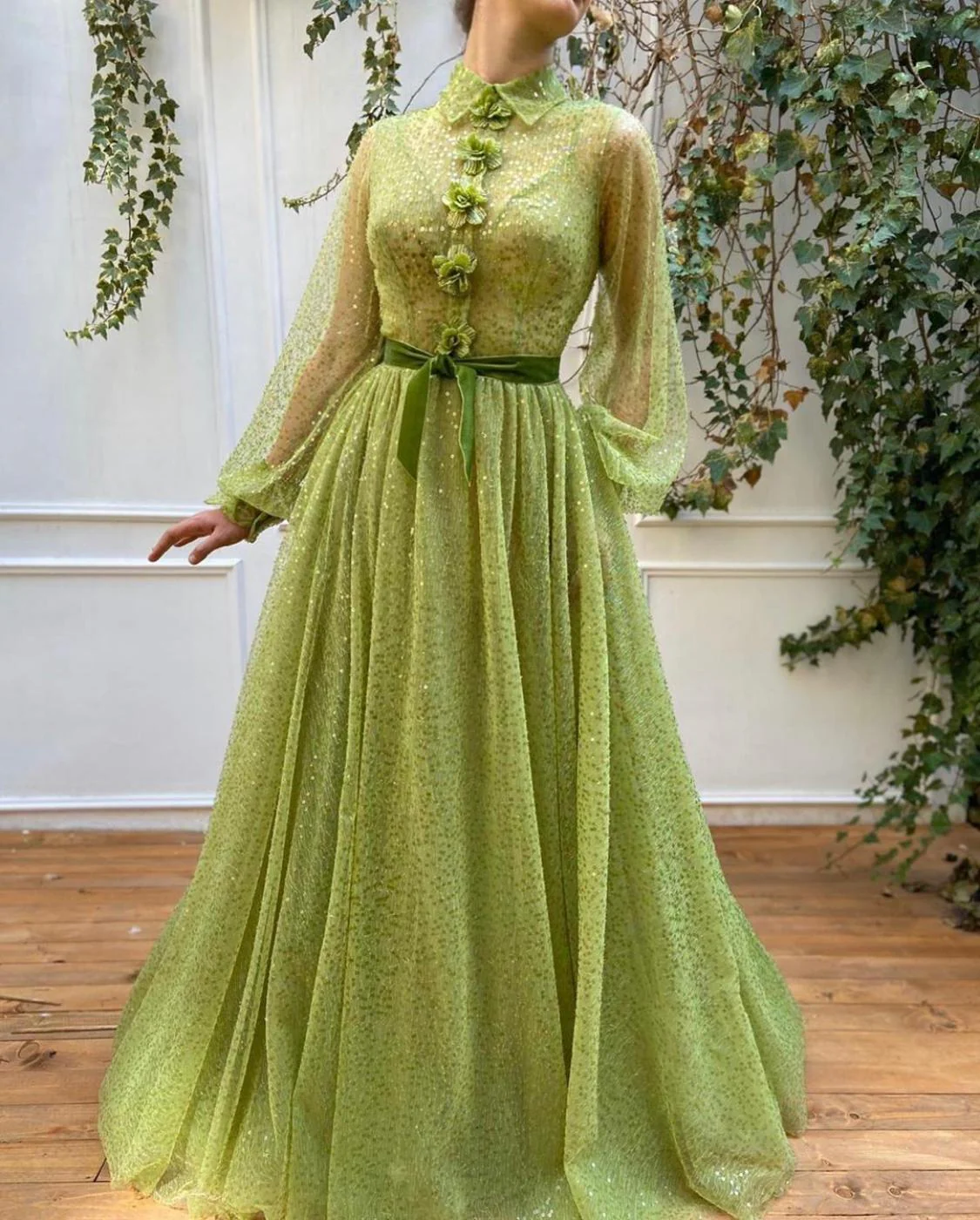 Wander an enchanted garden in the Mossy Sequined Gown. Rendered in sequined chiffon, this mossy colored gown evokes fairytales and romance. Finished with a collar and velvet sash.