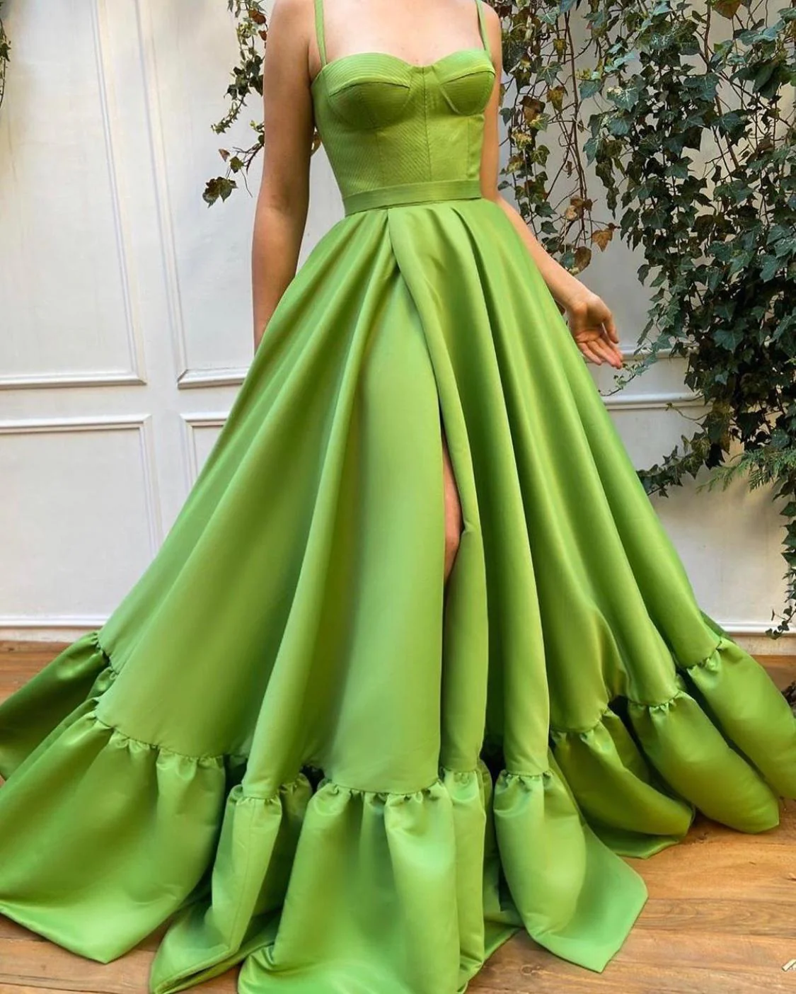Silk taffeta shines in an eccentric green pear hue. The Effortless Dahlia Gown is an eveningwear staple meant to be worn for years to come. With it’s A-line silhouette and bustier bodice, the flattering shape defines the waist and opens at the mid-thigh.