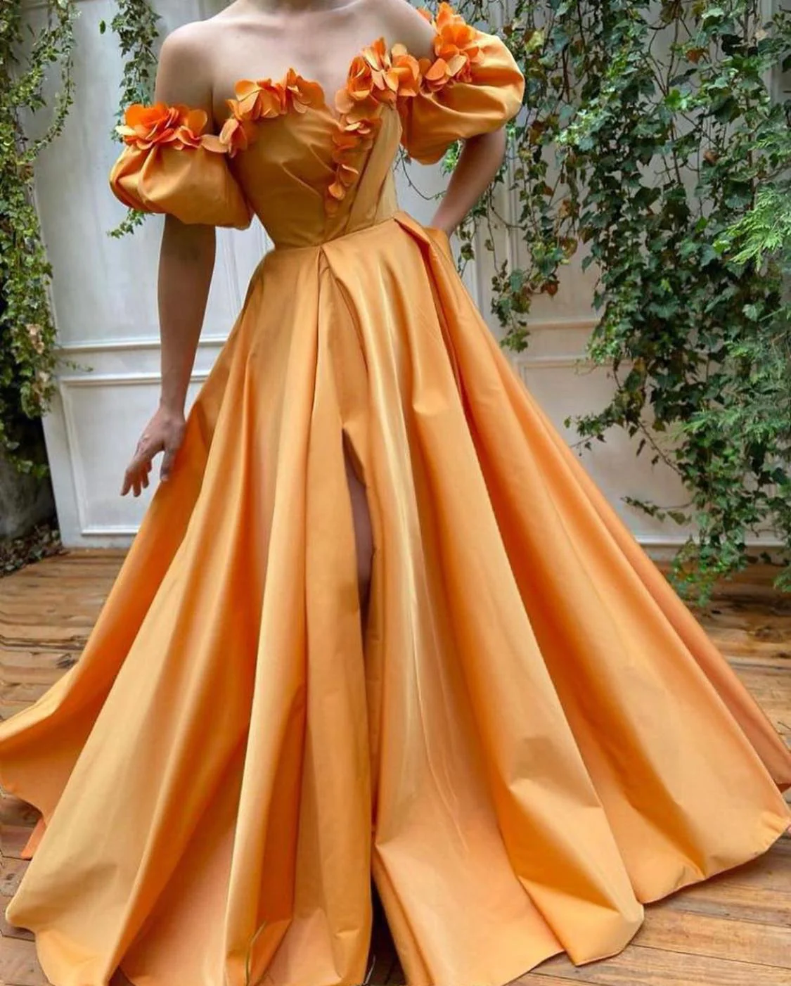 Sunsets were made for dancing, daydreaming, hopeless romantics and this gown. The Sunset Bloom Gown is constructed of stunning taffeta fabric in the color of a sunset before twilight. Embellished with flower petals and puff sleeves, this gown is off-the-shoulder. Cut with a thigh-high slit and defined waist.