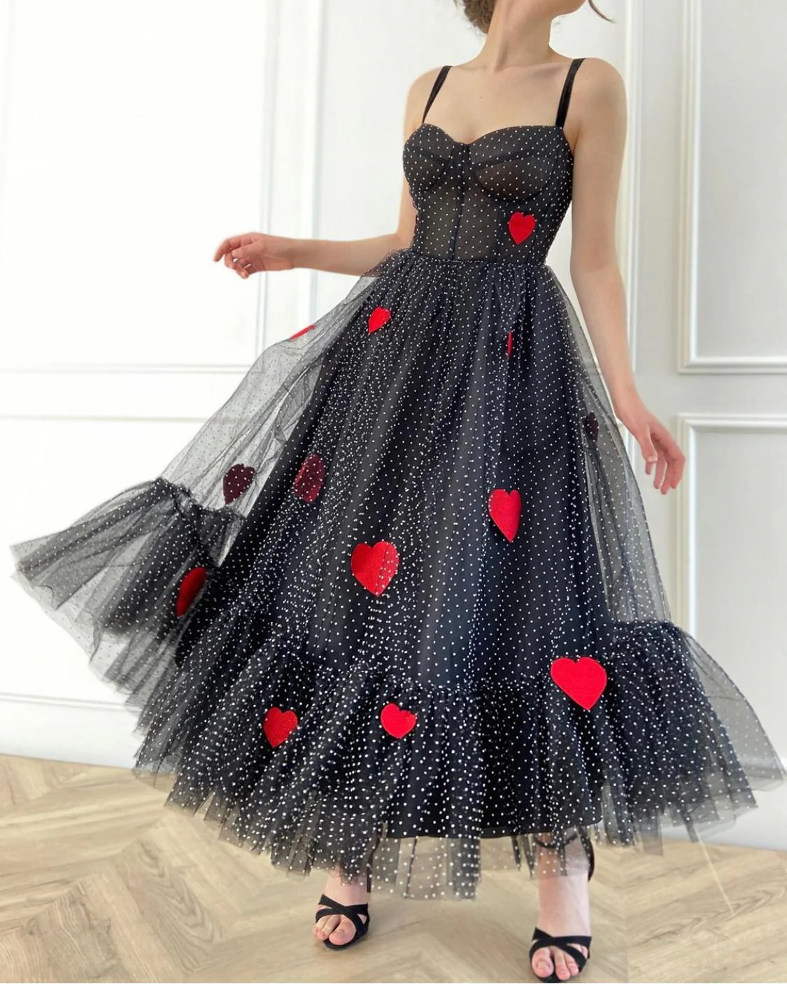 Hearts and polka dots collide in a classic Teuta Matoshi silhouette. The Hearty Dream Gown is a midi length flared style with a corset bustier and A line skirt. Punctuated with bright red hearts.