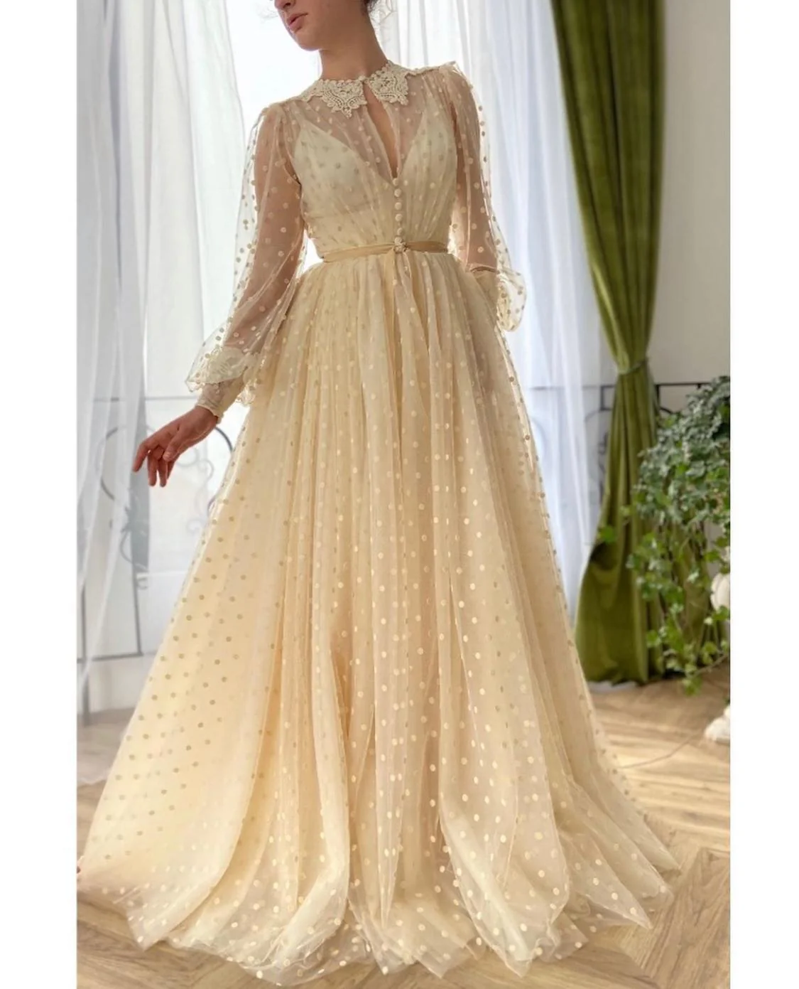 Pretty cream polka dots and delicate lace combine. The Magnolia Dots Gown is a floor-length style made of tulle with button details and a velvet skinny belt. The A-line silhouette and flowing sleeves add an element of romance.