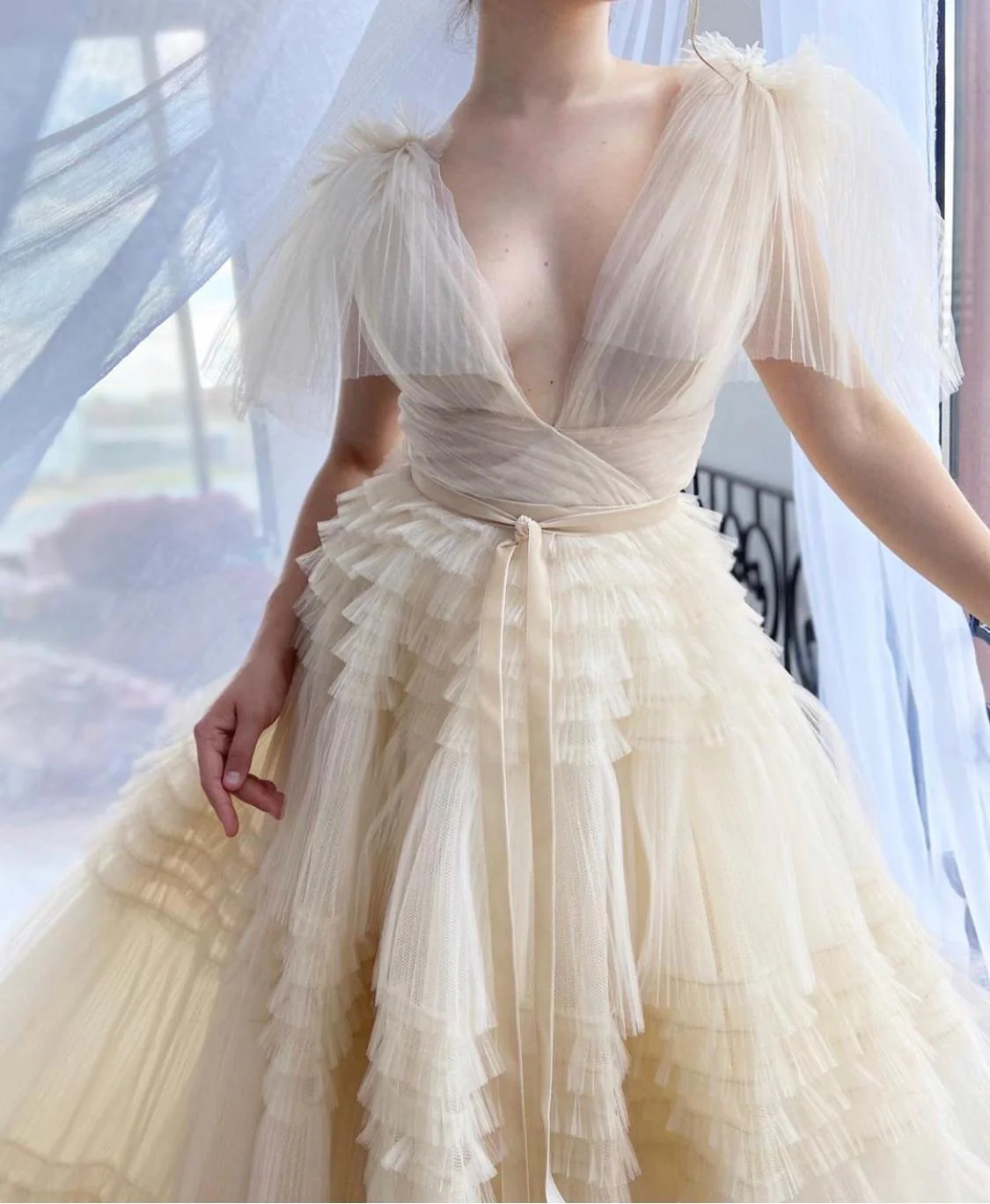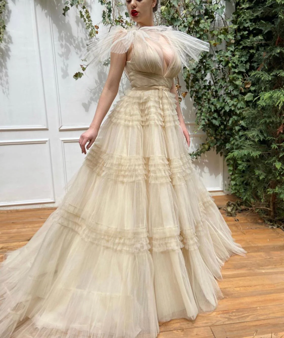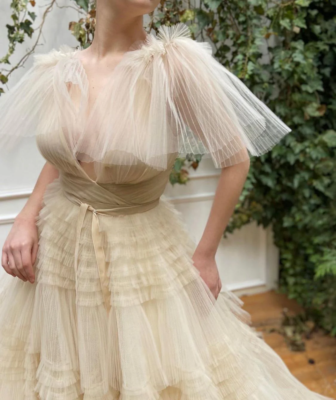 Celebrate the beauty of a subtle hue in the Creamy Aria Gown. Plisse tulle fabric is delicately ruffled throughout the skirt with an A-line waist definition. Complete with a V-neck bodice and pleated shoulders.