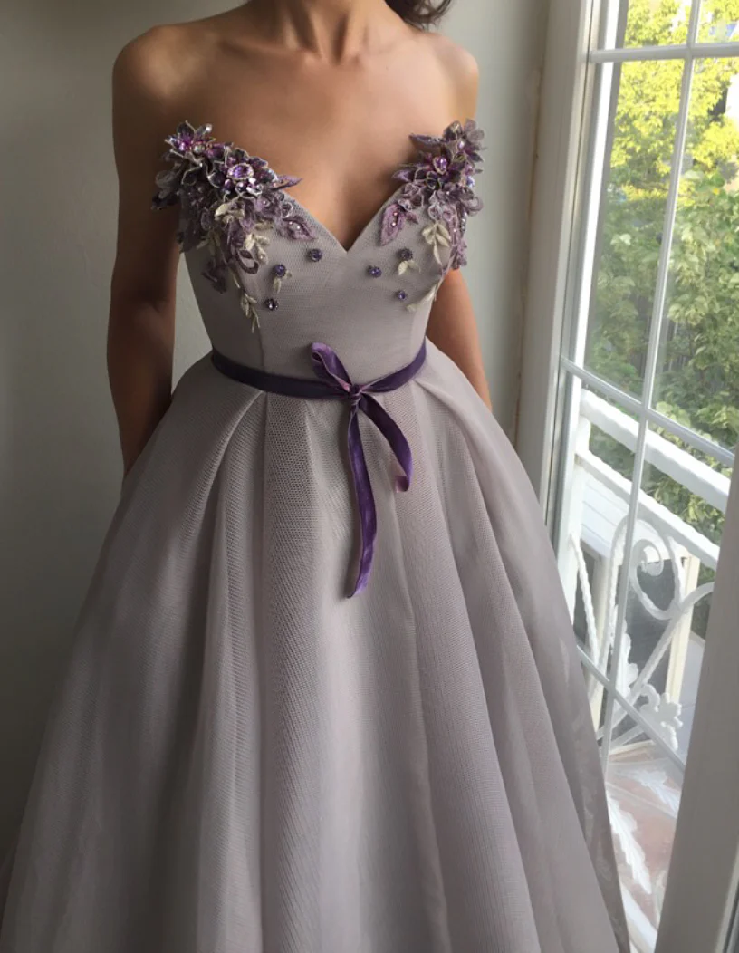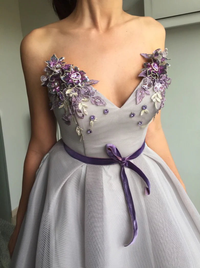 - Handmade embroidered flowers and violet belt