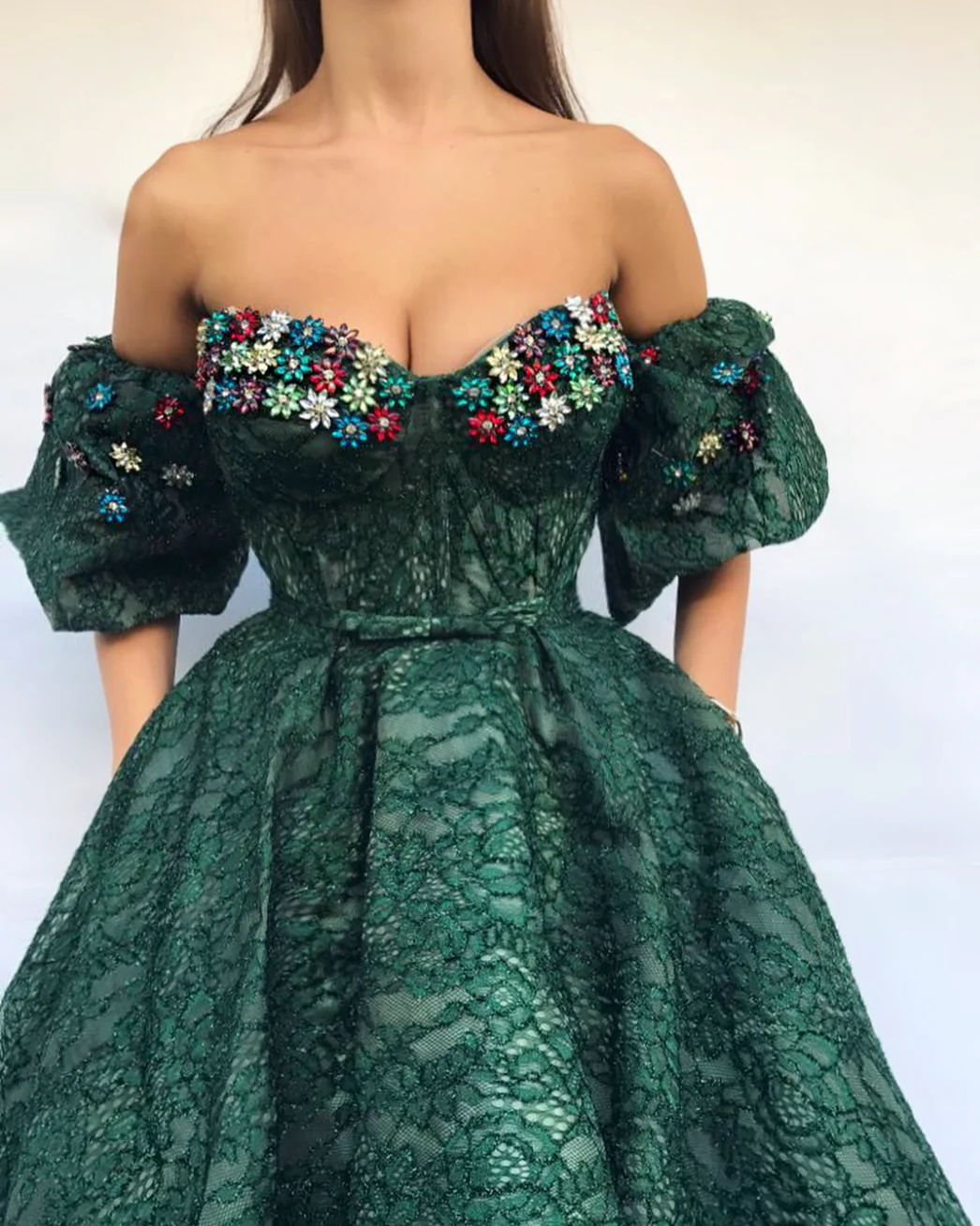 - Off-shoulder gown with puffy sleeves