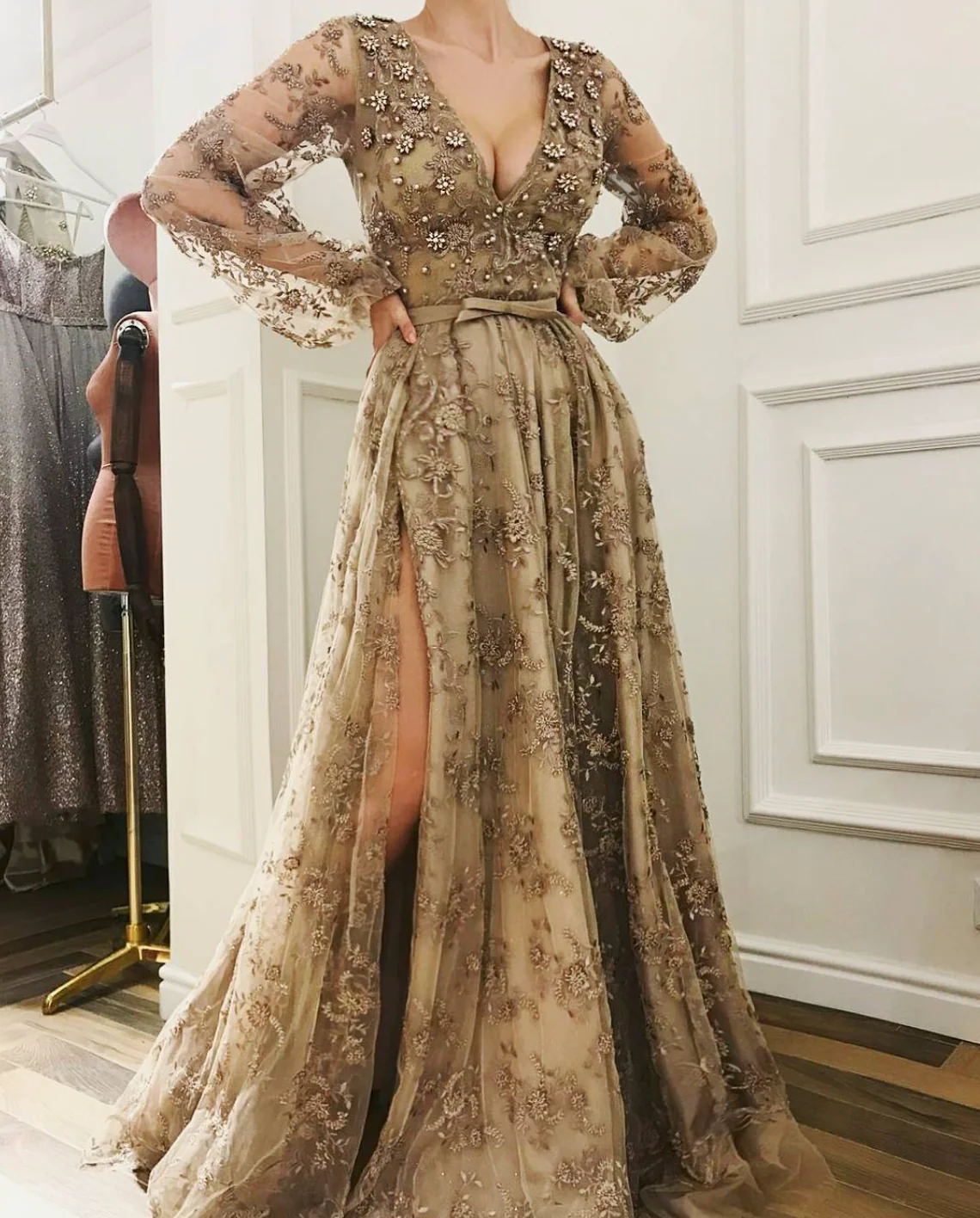 - Embroidered designs, crystal flowers, and pearls