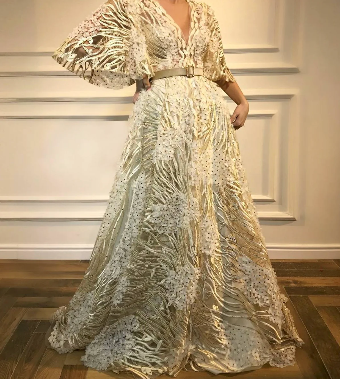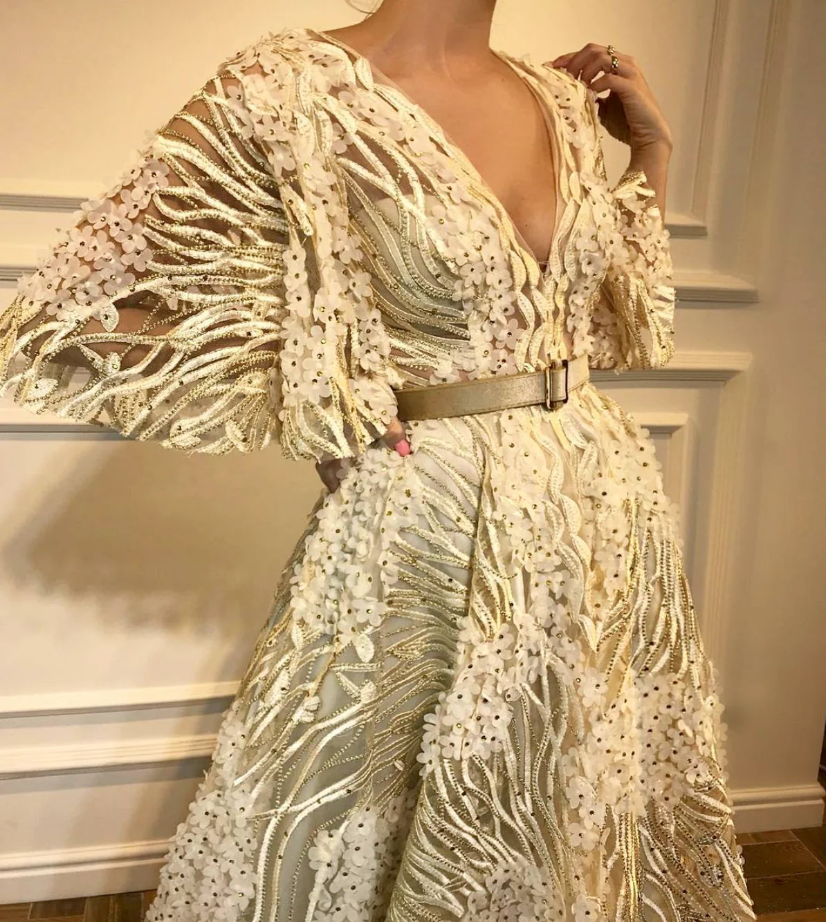 - Handmade embroidered creamy,shiny flowers and gold colored belt