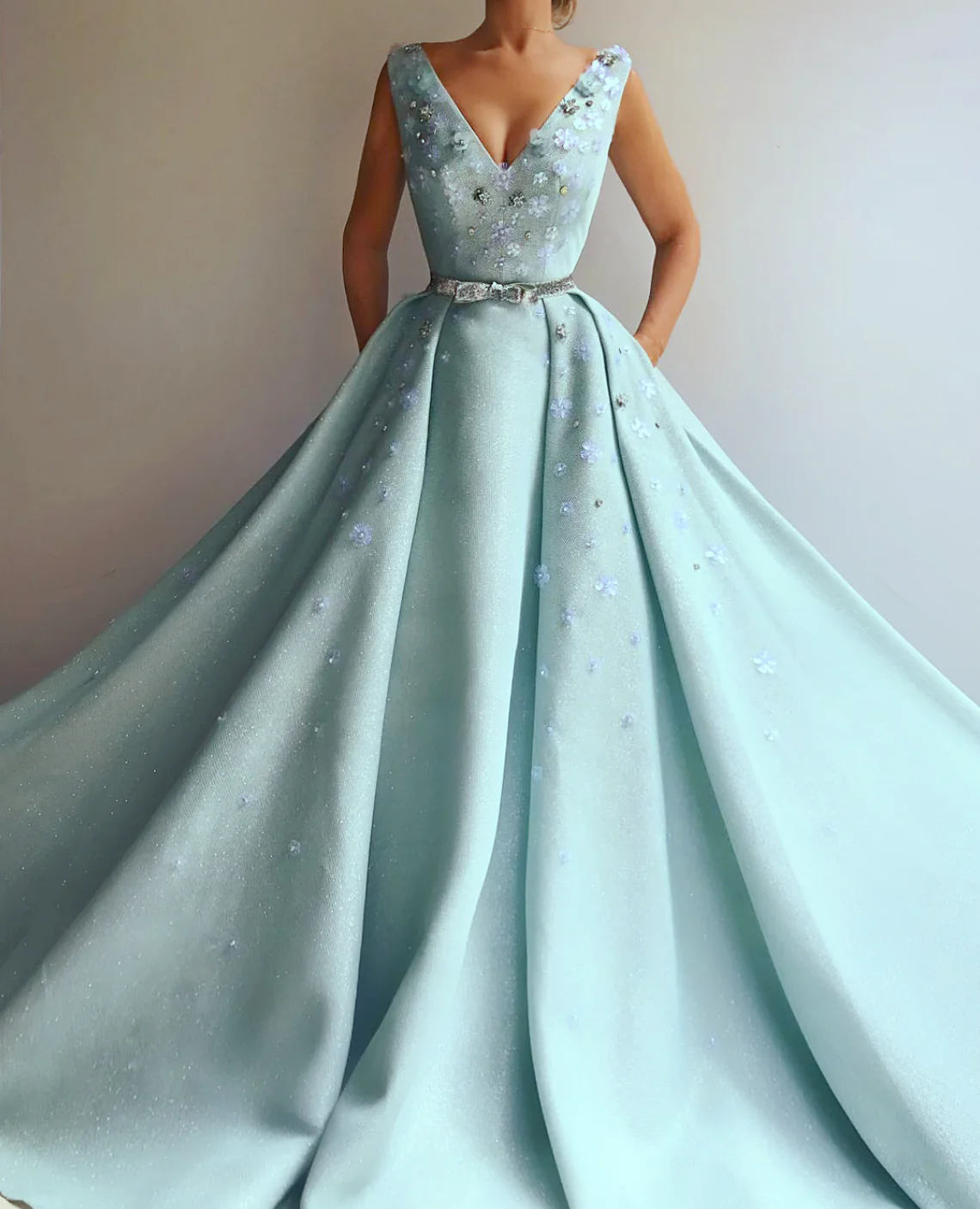 - Handmade embroidered flowers and silver belt